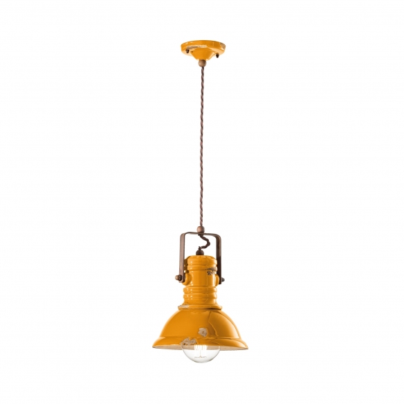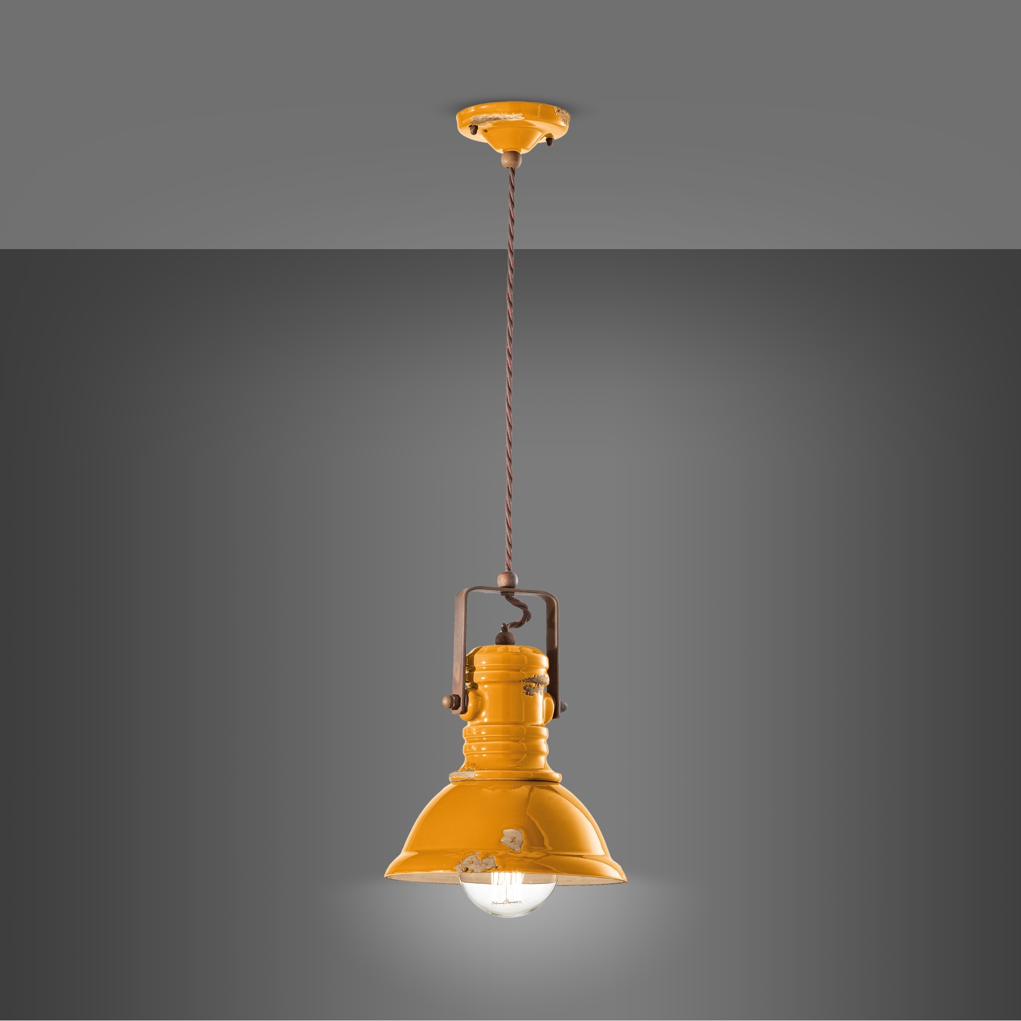 C1691 suspension lamp made of ceramic with cor ten antique iron details, covered cotton cable and rust effect enamelling. Inspired by classic industrial lamps, the C1691 pendant lamp is available in splendid colours, has a half-domed body with soft and pleasant lines and an iron hook that makes it more modern and up-to-date, perfect for illuminating a lounge or dining area of a single light, without ever being dazzling. Light source 1x53W E27 - IP20. Designed and manufactured by Ferroluce.