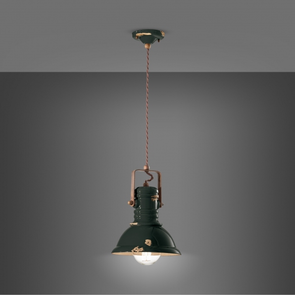 C1691 suspension lamp made of ceramic with cor ten antique iron details, covered cotton cable and rust effect enamelling. Inspired by classic industrial lamps, the C1691 pendant lamp is available in splendid colours, has a half-domed body with soft and pleasant lines and an iron hook that makes it more modern and up-to-date, perfect for illuminating a lounge or dining area of a single light, without ever being dazzling. Light source 1x53W E27 - IP20. Designed and manufactured by Ferroluce.