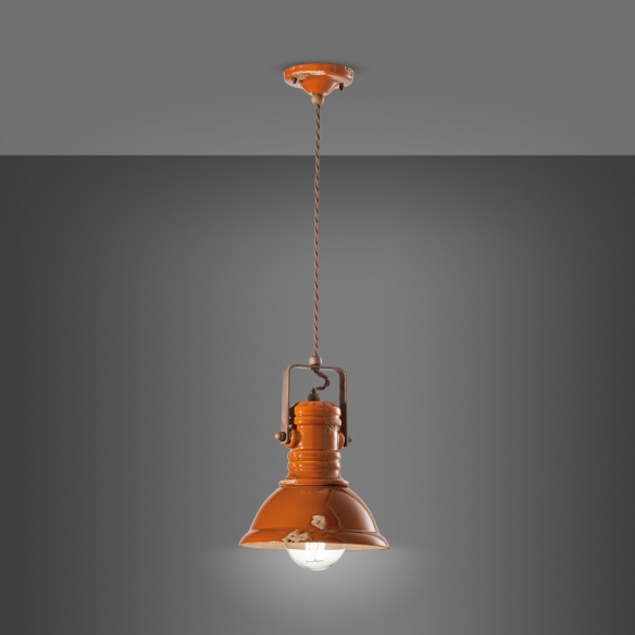 C1691 suspension lamp made of ceramic with cor ten antique iron details, covered cotton cable and rust effect enamelling. Inspired by classic industrial lamps, the C1691 pendant lamp is available in splendid colours, has a half-domed body with soft and pleasant lines and an iron hook that makes it more modern and up-to-date, perfect for illuminating a lounge or dining area of a single light, without ever being dazzling. Light source 1x53W E27 - IP20. Designed and manufactured by Ferroluce.