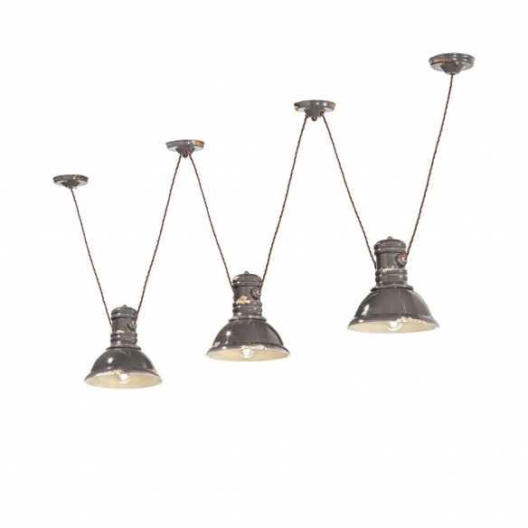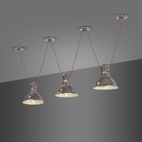 C1692 pendant lamp with three lights made of ceramic with cor ten antique iron details, covered cotton cable and rust effect enamelling. Inspired by classic industrial lamps, the C1692 suspension lamp is available in splendid colours, has three half-dome diffusers with soft and pleasant lines and iron hooks that make it more modern and up-to-date, perfect for illuminating a lounge or dining area of a single light, without ever being dazzling. Light source 3x53W E27 - IP20. Designed and manufactured by Ferroluce.