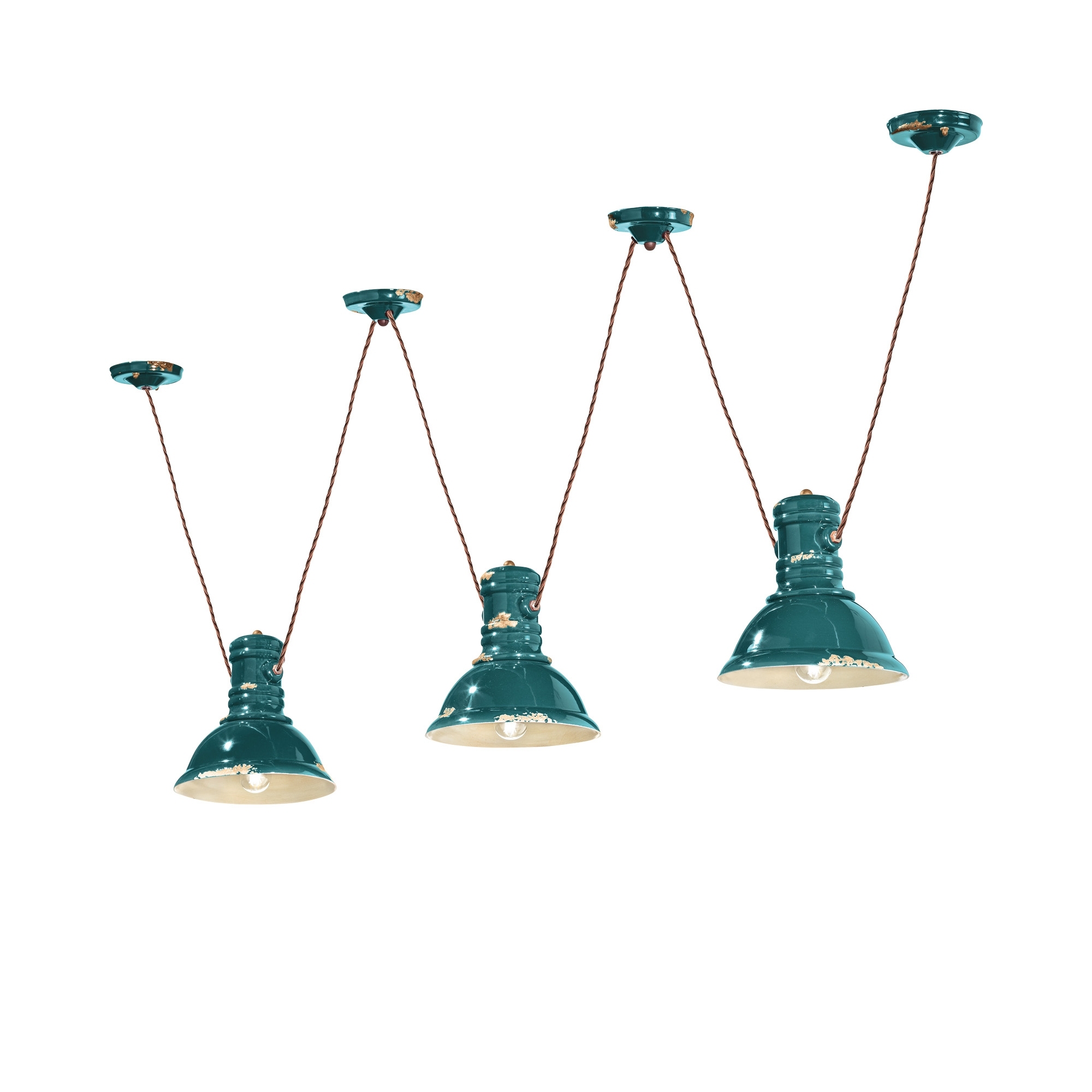 C1692 pendant lamp with three lights made of ceramic with cor ten antique iron details, covered cotton cable and rust effect enamelling. Inspired by classic industrial lamps, the C1692 suspension lamp is available in splendid colours, has three half-dome diffusers with soft and pleasant lines and iron hooks that make it more modern and up-to-date, perfect for illuminating a lounge or dining area of a single light, without ever being dazzling. Light source 3x53W E27 - IP20. Designed and manufactured by Ferroluce.