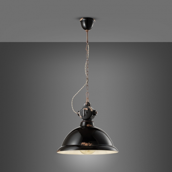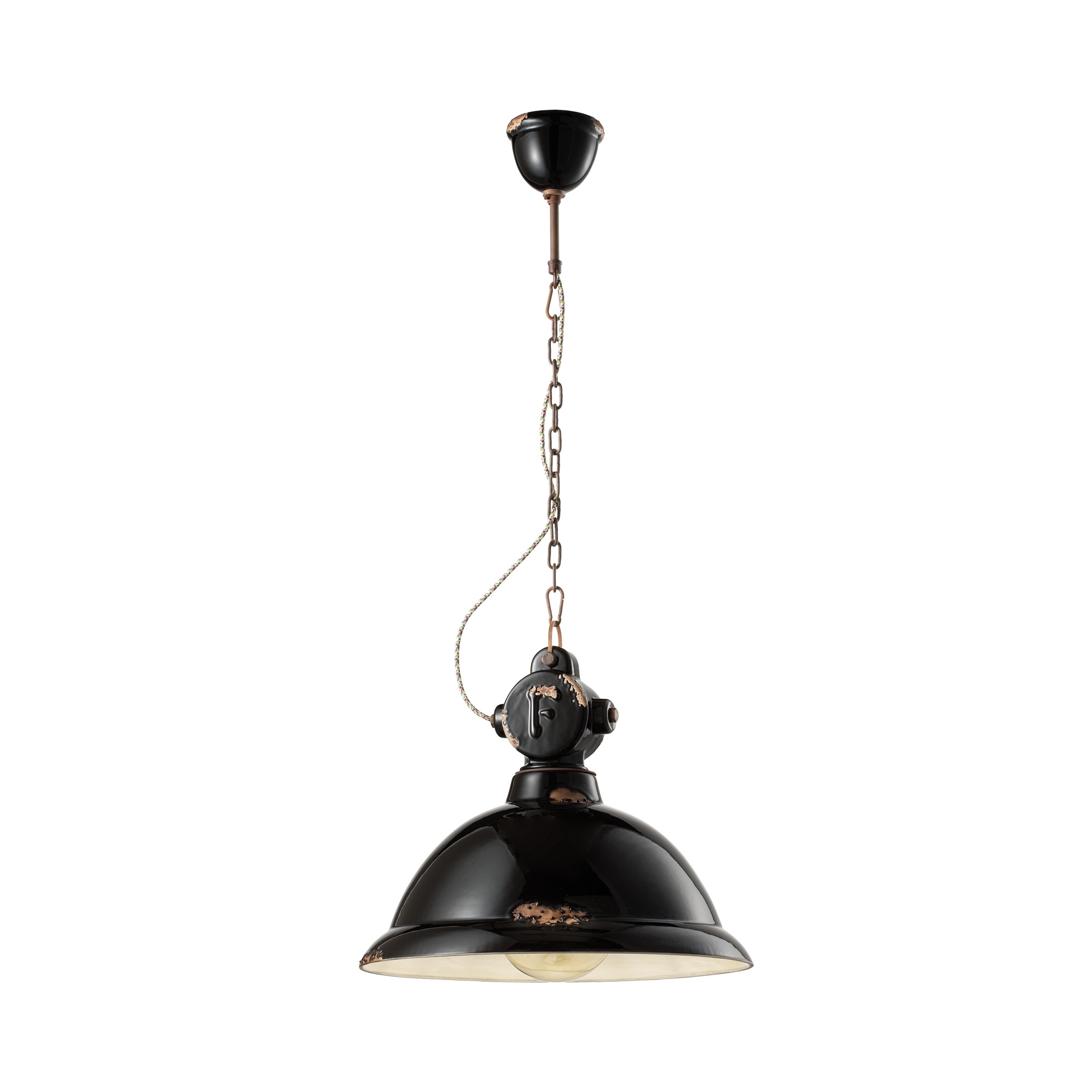 C1710 suspension lamp made of ceramic with details and chain in cor ten antique iron, covered cotton cable and rust effect enamelling. Perfect for lighting and decorating a bistro, bar or cafeteria, the C1710 suspension lamp has a large dome-shaped diffuser and a hook that connects it to the suspension cable with the manufacturer's initials impressed and warms the room without ever be pretentious. The lamp fits with the same ease even in private contexts such as a living room or a kitchen. Light source 1x105W E27 - IP20. Designed and manufactured by Ferroluce.