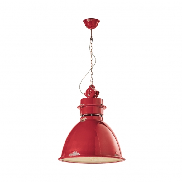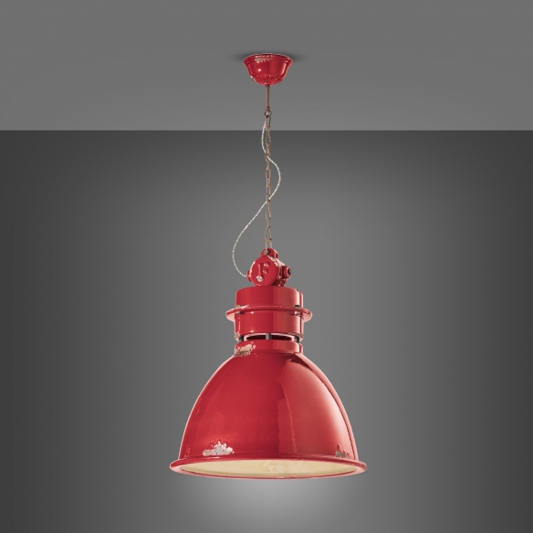 C1750 pendant lamp made of ceramic with details and chain in cor ten antique iron, covered cotton cable and rust effect enamelling. Perfect for illuminating and furnishing a dining or living area, the C1750 suspension lamp is characterized by a large dome-shaped diffuser and circular rings bearing the manufacturer's initials. The lamp is available in several colors and fits with the same ease in public contexts such as a bistro, a bar or a cafeteria. Light source 1x105W E27 - IP20. Designed and built by Ferroluce.