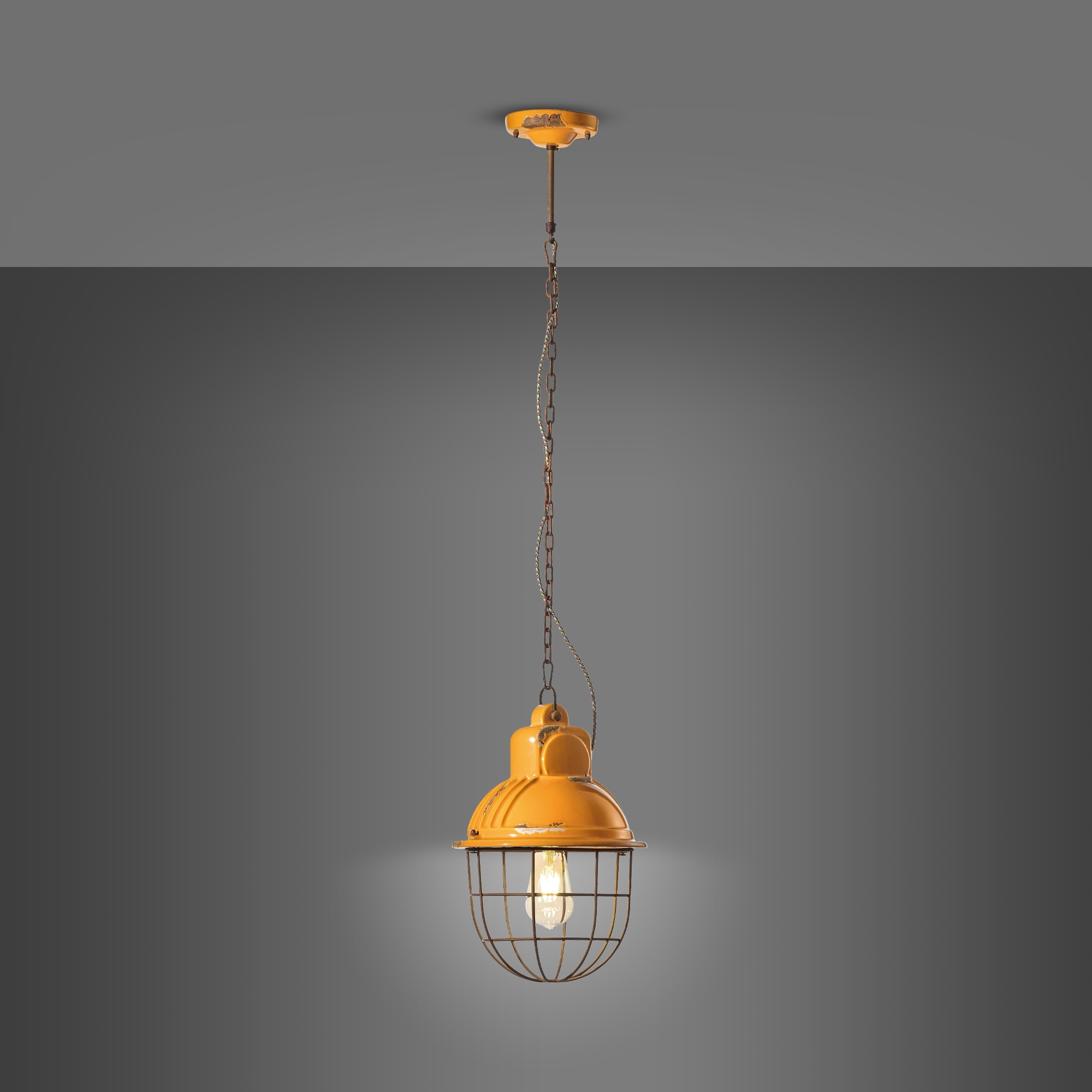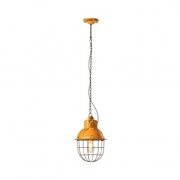 C1770 pendant lamp made of ceramic with basket and chain in cor ten antique iron, covered cotton cable and rust effect enamelling. Perfect for illuminating and furnishing a dining or living area, the C1770 suspension lamp has a hemispherical lamp holder in which the light is enclosed in a metal mesh and is somewhat reminiscent of classic garden lanterns even if it was specifically designed to fit into environments interior. You can combine several elements together and also place it in a bistro, bar or café. Light source 1x105W E27 - IP20. Designed and manufactured by Ferroluce.