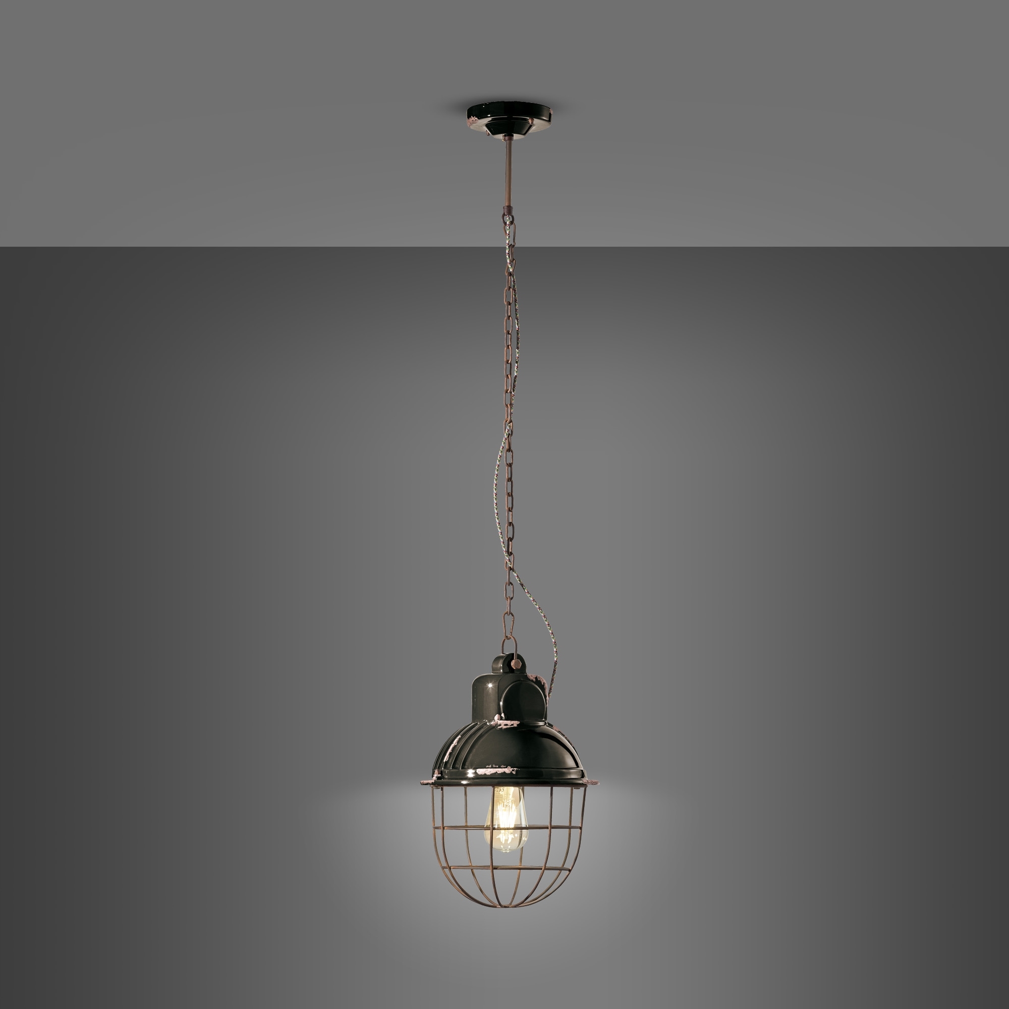C1770 pendant lamp made of ceramic with basket and chain in cor ten antique iron, covered cotton cable and rust effect enamelling. Perfect for illuminating and furnishing a dining or living area, the C1770 suspension lamp has a hemispherical lamp holder in which the light is enclosed in a metal mesh and is somewhat reminiscent of classic garden lanterns even if it was specifically designed to fit into environments interior. You can combine several elements together and also place it in a bistro, bar or café. Light source 1x105W E27 - IP20. Designed and manufactured by Ferroluce.