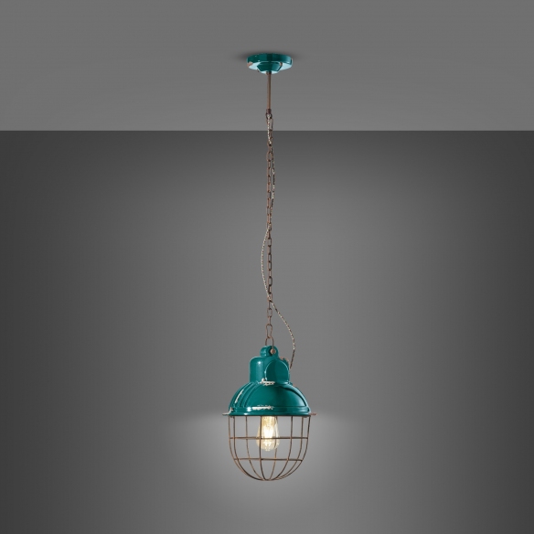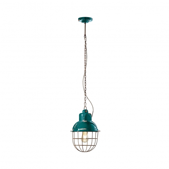 C1770 pendant lamp made of ceramic with basket and chain in cor ten antique iron, covered cotton cable and rust effect enamelling. Perfect for illuminating and furnishing a dining or living area, the C1770 suspension lamp has a hemispherical lamp holder in which the light is enclosed in a metal mesh and is somewhat reminiscent of classic garden lanterns even if it was specifically designed to fit into environments interior. You can combine several elements together and also place it in a bistro, bar or café. Light source 1x105W E27 - IP20. Designed and manufactured by Ferroluce.