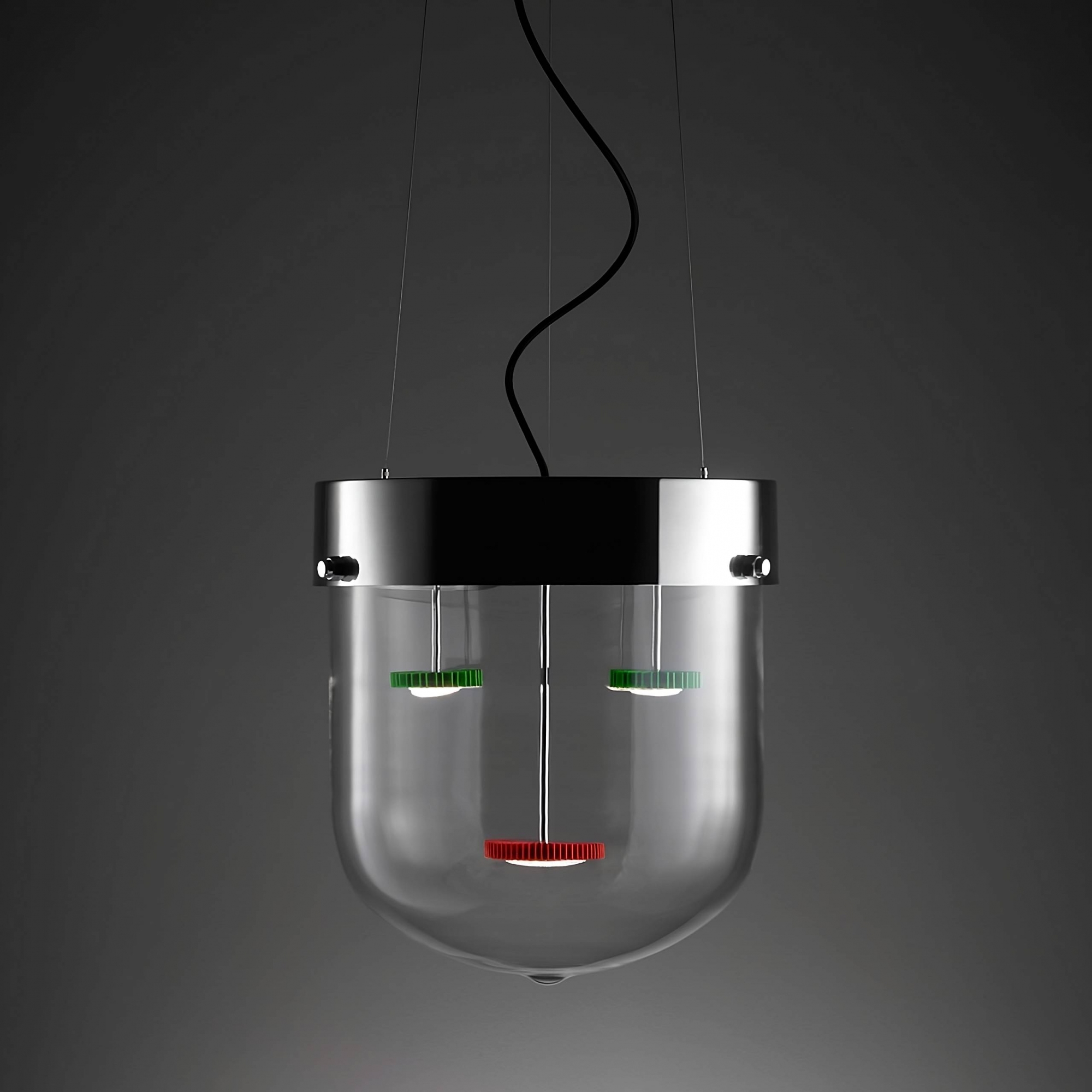 Faccia suspension lamp made of steel and blown glass. Lamp with a very particular and fun design, Faccia stands out for its large blown glass diffuser, which shows a face. The lamp emits direct and diffused light at the same time, thanks to the three LED cards located inside the face. The lamp also has a painted metal bandana, available in different colors, which contains the electrical connections and closes the glass face. Designed by Carlo Guglielmi for Firmamento Milano.