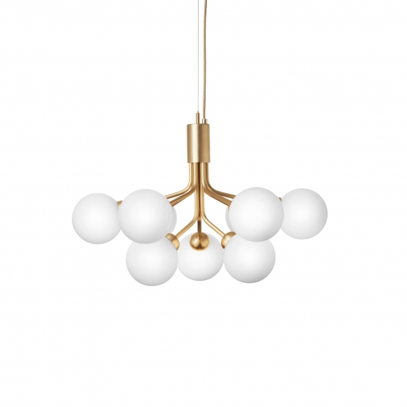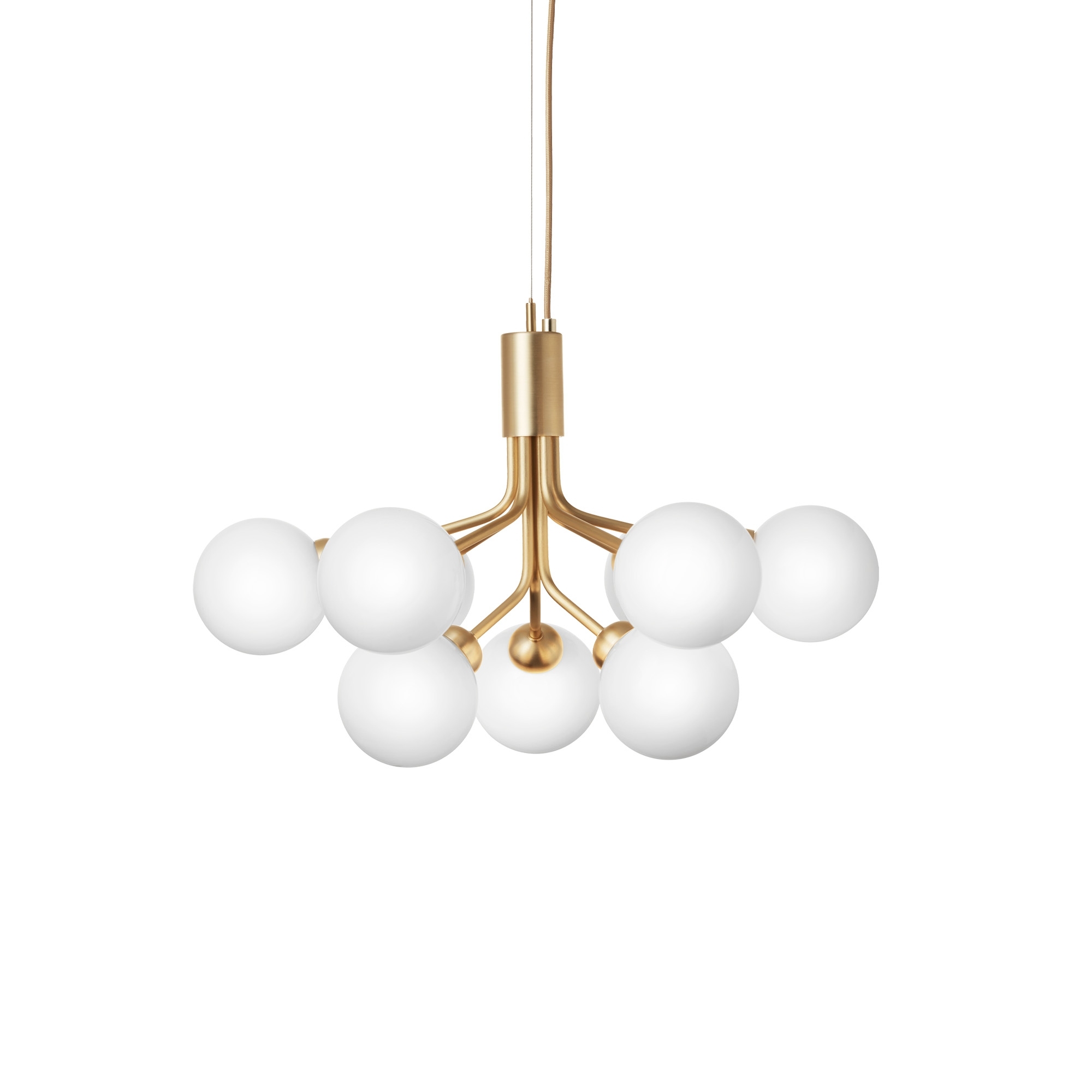 The Apiales 9 pendant lamp in metal, features nine sources of light, each encased in hand-blown glass created by skilled artisans. The Apiales 9 lamp comes in four different versions (from traditional brass to modern nickel), suitable for any setting, from vintage to contemporary. The use of LED technology ensures maximum durability and effective illumination, also helping to create a warm and sophisticated atmosphere. The lamp's arms spread out like flower stems, elegantly dispersing light throughout the space. Designed by Sofie Refer for Nuura.