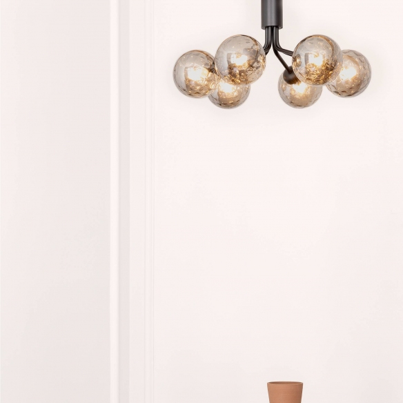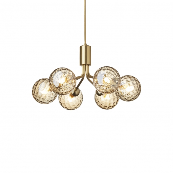 The Apiales 6 pendant lamp, crafted of metal, is a blend of traditional craftsmanship and contemporary style. The Apiales 6 is available in four different versions, from sophisticated brass to modern nickel, allowing it to be installed in any space within the home, turning it into a true oasis of natural beauty. The lamp features six hand-blown glass globes that radiate a warm and welcoming light, evoking the delicate beauty of blooming petals. LED technology ensures efficient and sustained illumination. Designed by Sofie Refer for Nuura.