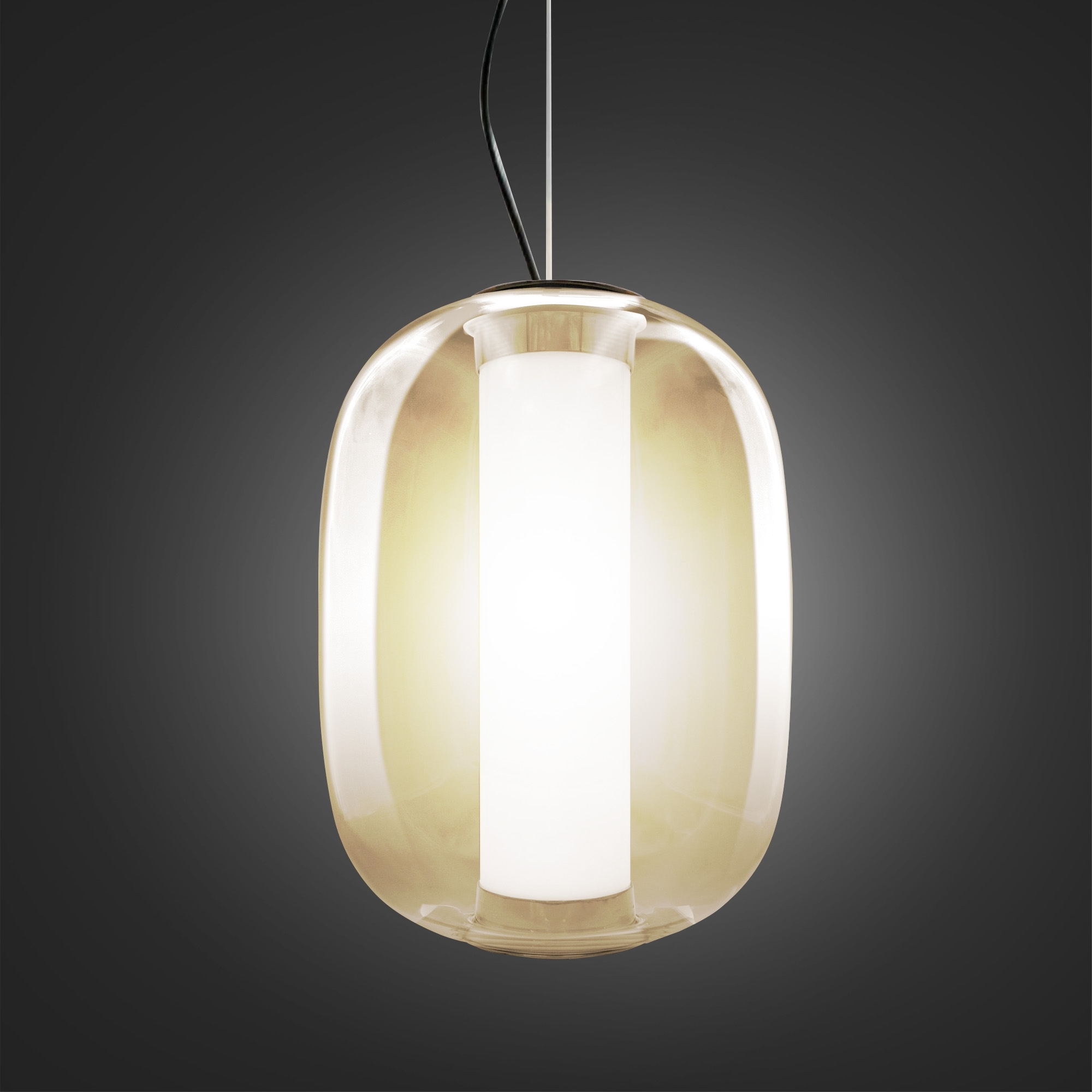 The Meridiano (medium version) pendant lamp by Fontana Arte is designed with a nickel-plated metal frame, an external blown glass diffuser, an internal Pyrex glass diffuser painted on the inside, and a steel suspension cable. Available in three exquisite color finishes, the Meridiano pendant lamp blends innovative design and artistic quality, integrating harmoniously with any furnishing style, from a living room with a minimalist design to a bedroom with a modern and avant-garde style. The unique design of the Meridiano is characterized by a clear glass capsule that encloses the light source, creating a refined and modern aesthetic effect. The possibility of using it individually or in multiple compositions arranged in clusters allows it to adapt to different spaces and lighting needs, making it an ideal solution for residential and exhibition environments. Fontana Arte continues to offer solutions that not only illuminate spaces but transform them, making the Meridiano pendant lamp a perfect example of their design philosophy. Light source: LED 25W (2700K, CRI>90, 2900Lm) + LED 8W (2700K, 1180Lm). Designed by Gabriele and Oscar Buratti for Fontana Arte.