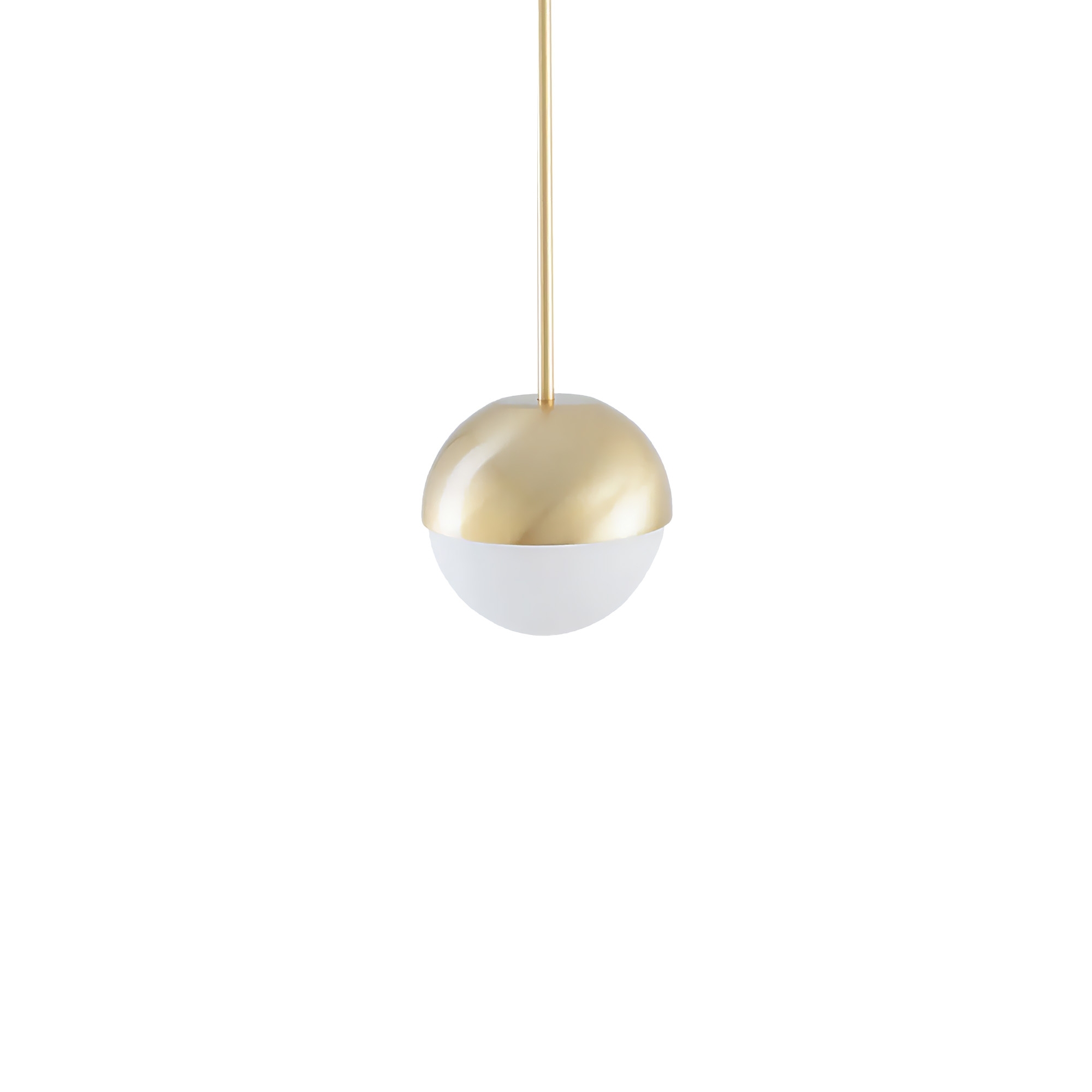 The Pallina pendant lamp is crafted with a galvanized metal frame featuring a double interchangeable rod, a diffuser in opaline frosted blown glass, and a ceiling rose in painted polycarbonate. Available in 4 stunning colors, the Pallina pendant lamp represents the synergy between the perfect form of the sphere and the elegance of glass, resulting in the most essential item in the Fontana Arte catalog. Pallina, a true must-have, will find its rightful place in every corner of the home thanks to its universal shape and its warm, welcoming light. This piece brings a warm and inviting light to every room, telling the story of Italian design through its unique style. The essence of the perfection of glass and the sphere blend to offer a piece that is, without a doubt, a must-have for all who appreciate quality design. Designed by FontanaArte Design Lab.