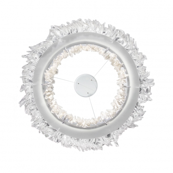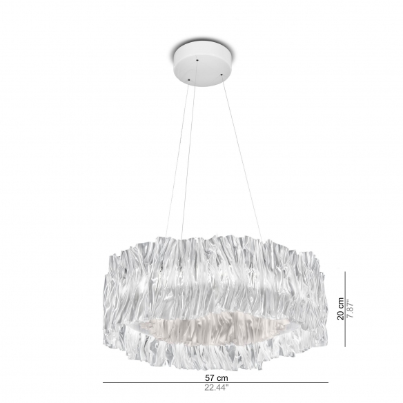 The Accordéon pendant lamp is a stunning creation by Slamp, comprised of two circles, one in Lentiflex® with a prismatic effect and the inner one available in three different colors. Moreover, these rings are handcrafted through a meticulous pleating process involving the heating of the material at a controlled temperature. Versatility is the strong suit of this pendant lamp as it seamlessly adapts to a variety of settings, from elegant living rooms to modern offices, exhibition spaces to lounges. The integrated LED circuit is dimmable and available both at 2700 and 3000 Kelvin, offering adjustable lighting options. This pendant lamp is not merely a functional object but stands as a true masterpiece of contemporary art, capable of enhancing and furnishing both modern and traditional spaces. Its commanding presence within a room is unmistakable, drawing gazes and provoking the curiosity of guests. Designed by Marc Sadler for Slamp.
