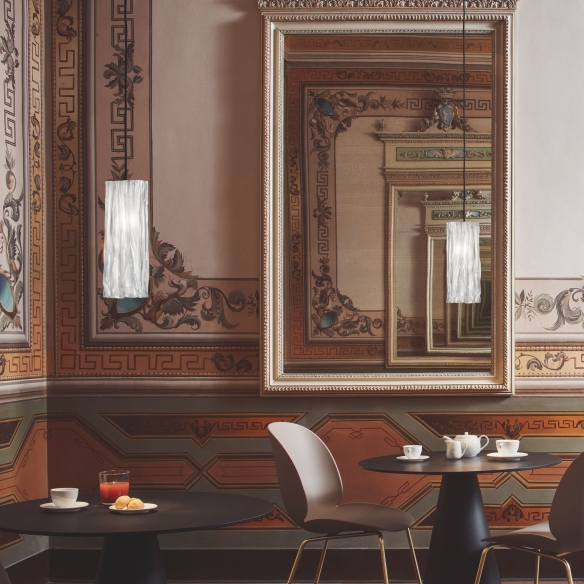 The Accordéon Vertical Suspension Lamp by Slamp is a magnificent creation made of Lentiflex®. It features a cylindrical diffuser that is 30 cm in length – available in transparent and gold finishes, a ceiling attachment cable dressed in black, and a mini cup in silver color. The lamp's versatility is its strength, as it perfectly fits a range of settings, whether residential or commercial, from elegant living rooms to modern office spaces, exhibition areas to lounges. This lamp is not simply a functional item; it also stands as a true modern work of art, capable of enhancing and complementing both modern and traditional spaces alike. Its presence in a room is undeniable, drawing attention and sparking the curiosity of guests. Designed by Marc Sadler for Slamp.
