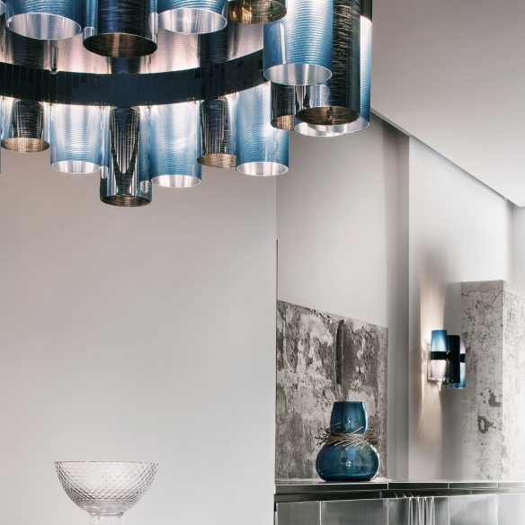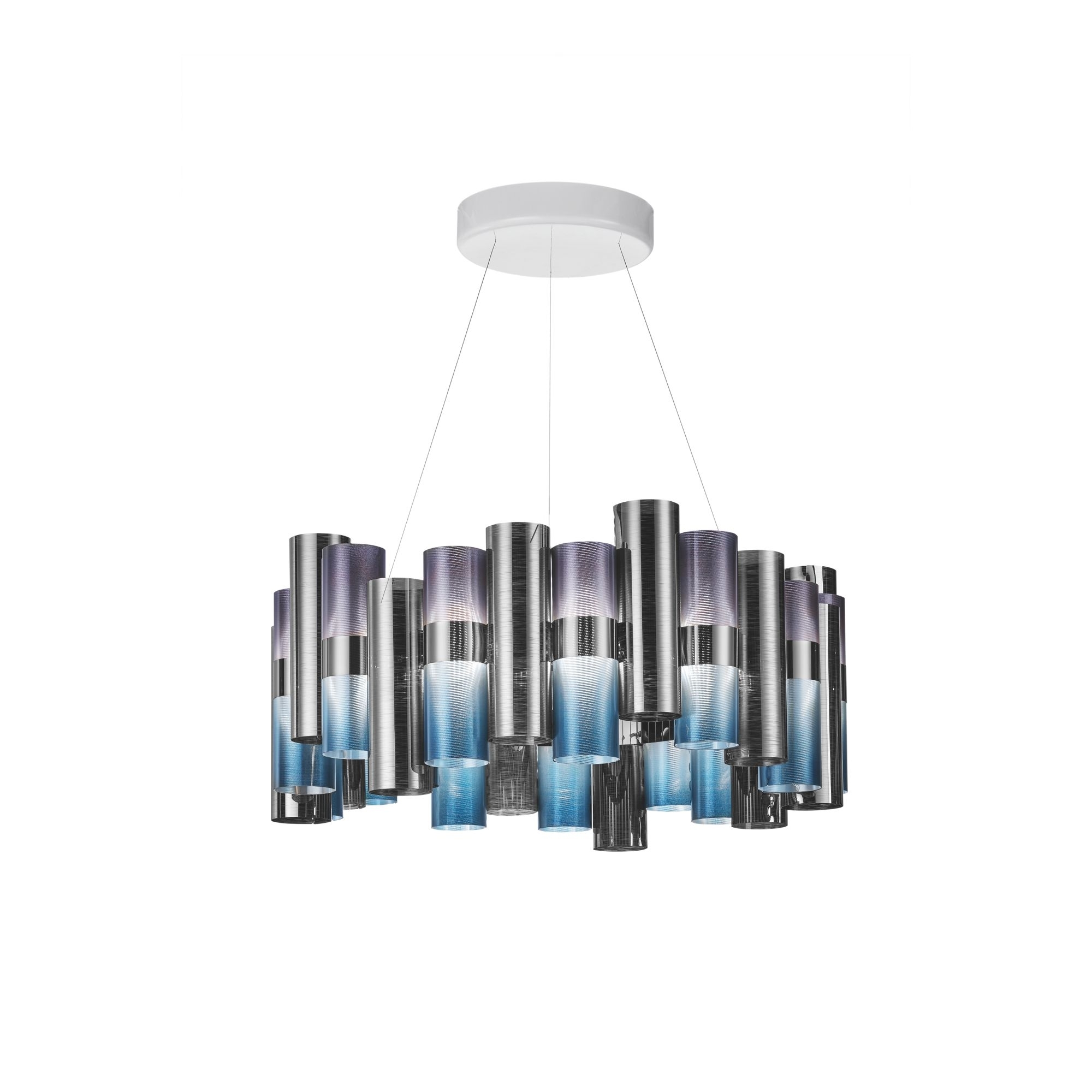 The La Lollo pendant lamp, in the large version, is a homage to the glittering 1950s and their retro charm. Manufactured by Slamp in Lentiflex®, this majestic pendant light is composed of a series of unbreakable and lightweight technopolymer cylinders arranged on a central ring with integrated LEDs. This version of La Lollo has a diameter of 80 cm and is easy to install, opulent, and dramatic. Additionally, there is a wide variety of color options available, making it perfectly adaptable to any setting: whether placed in a living room, dining room, commercial areas such as hotel lobbies or restaurants, La Lollo creates a luxurious and welcoming atmosphere, adding a touch of joy and life. Designed by Lorenza Bozzoli for Slamp.