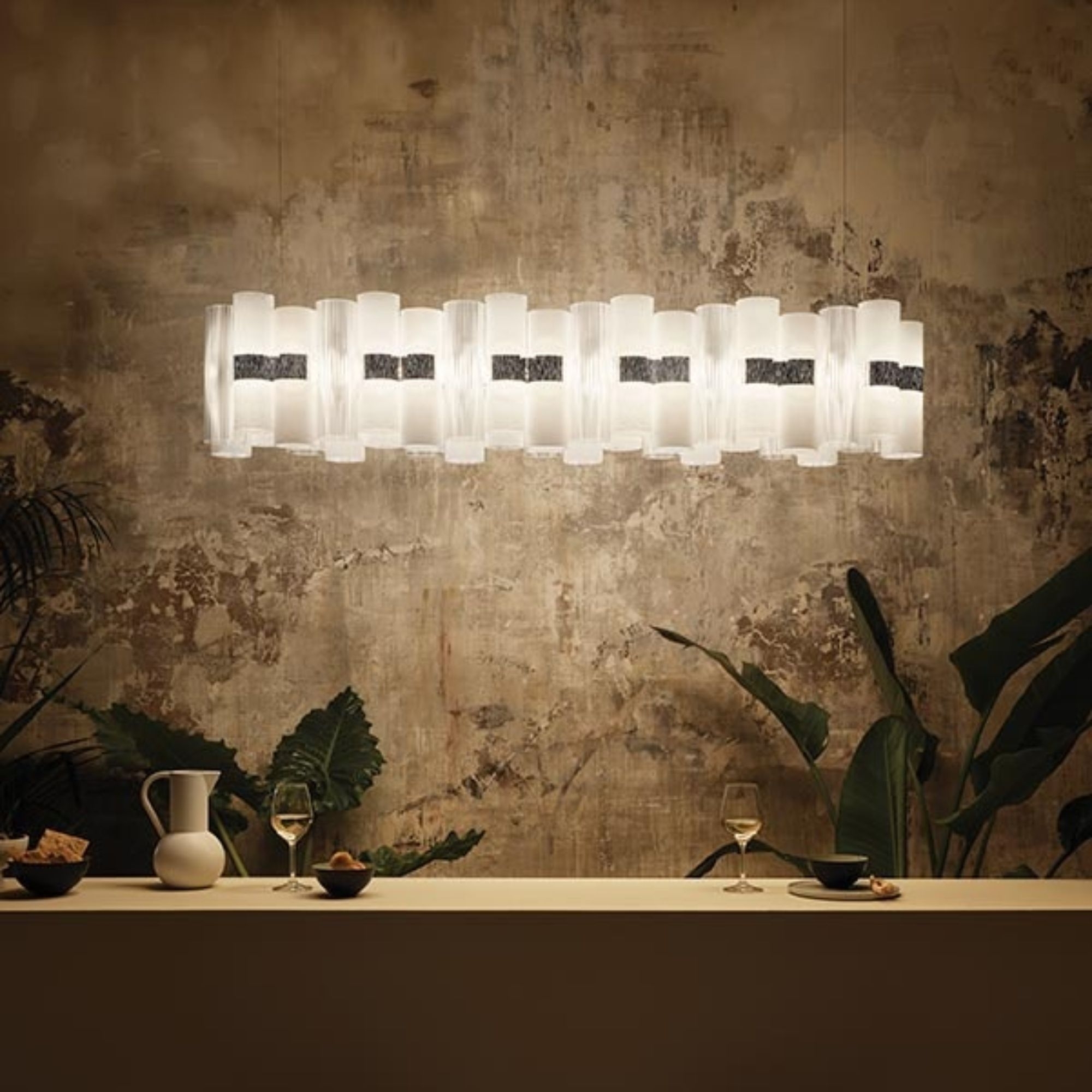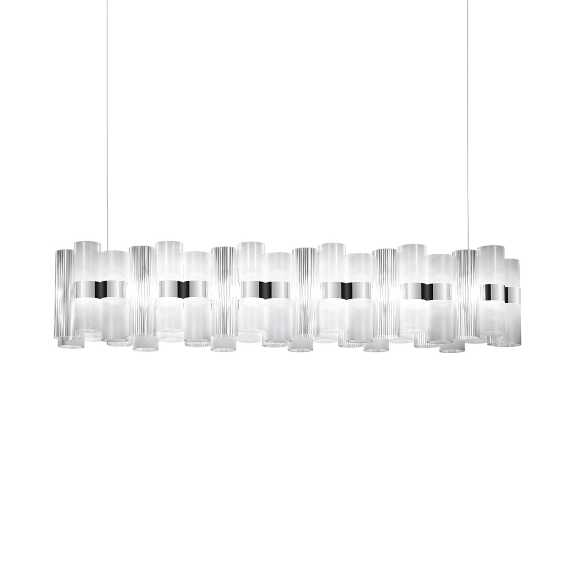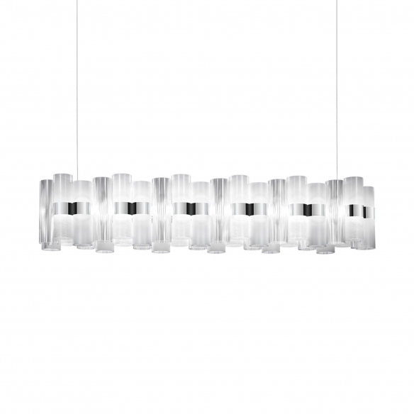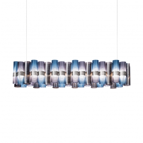 The La Lollo Linear 140 pendant lamp is a tribute to the sparkling 1950s and their retro charm. Crafted by Slamp in Lentiflex®, this magnificent pendant light is comprised of a series of unbreakable and lightweight technopolymer cylinders arranged on a central ring with integrated LEDs. This iteration of La Lollo has a length of 140 cm and is easy to install, opulent, and dramatic. Additionally, there is an extensive selection of colors available, ensuring it can be perfectly matched to any setting: whether it's placed in a living room, dining room, or in commercial spaces like hotel lobbies or restaurants, the La Lollo Linear creates a luxurious and inviting atmosphere, adding a touch of joy and vibrancy. Designed by Lorenza Bozzoli for Slamp.