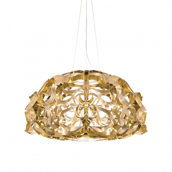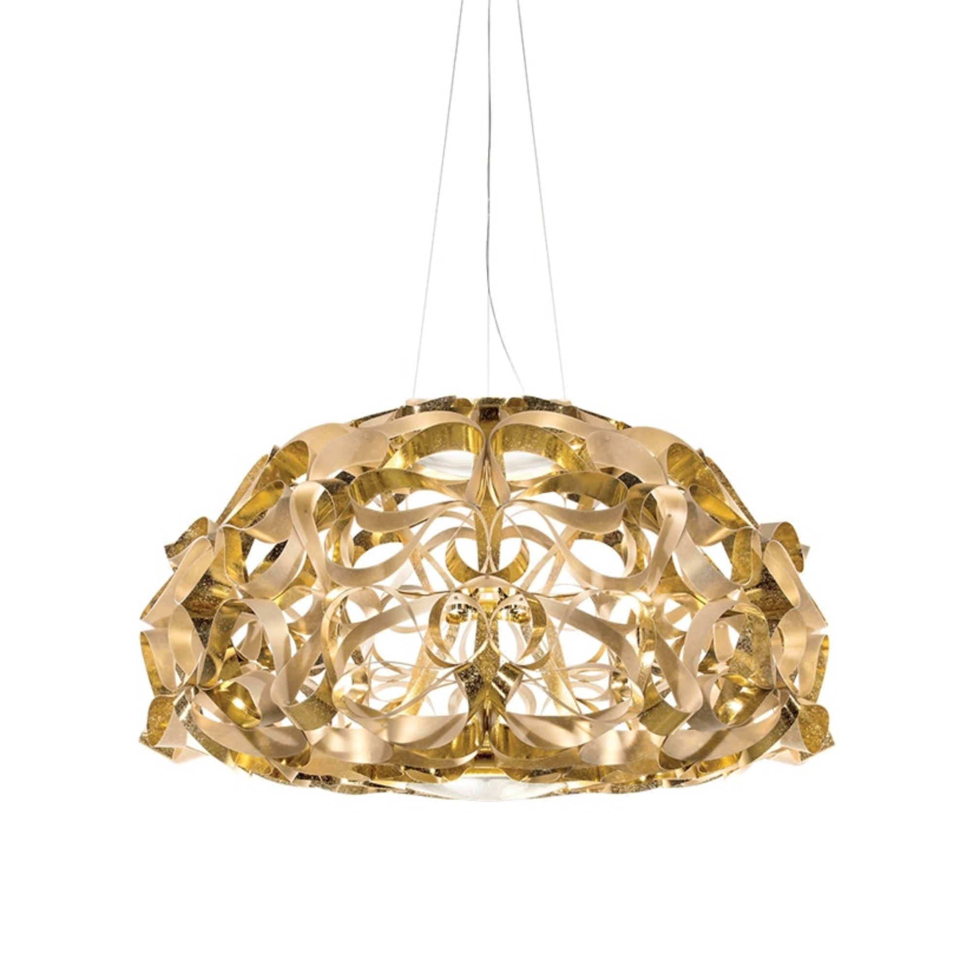 The Quantica 75 pendant lamp is a Slamp creation that transcends simple lighting to become the centerpiece of any room, crafted in Opalflex®. Drawing inspiration from the concept of "quantum entanglement," its shape embodies the interconnection of all cosmic elements. The interplay of light and form gives rise to a dense and luxurious sculpture, fitting for residential, commercial, and professional spaces alike: whether hung in a living room, an office, or within the refined setting of restaurants or elegant waiting rooms, Quantica carries with it a passion and taste for design. The golden texture is achieved with a layer of foil applied to the Opalflex®, lending the piece a radiant and delicate appeal. With this sculpture, Slamp once again proves how design can be both functional and deeply expressive, inviting everyone to explore new dimensions of aesthetics and lighting. Designed by Adriano Rachele for Slamp.