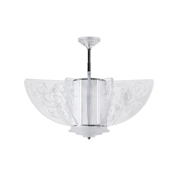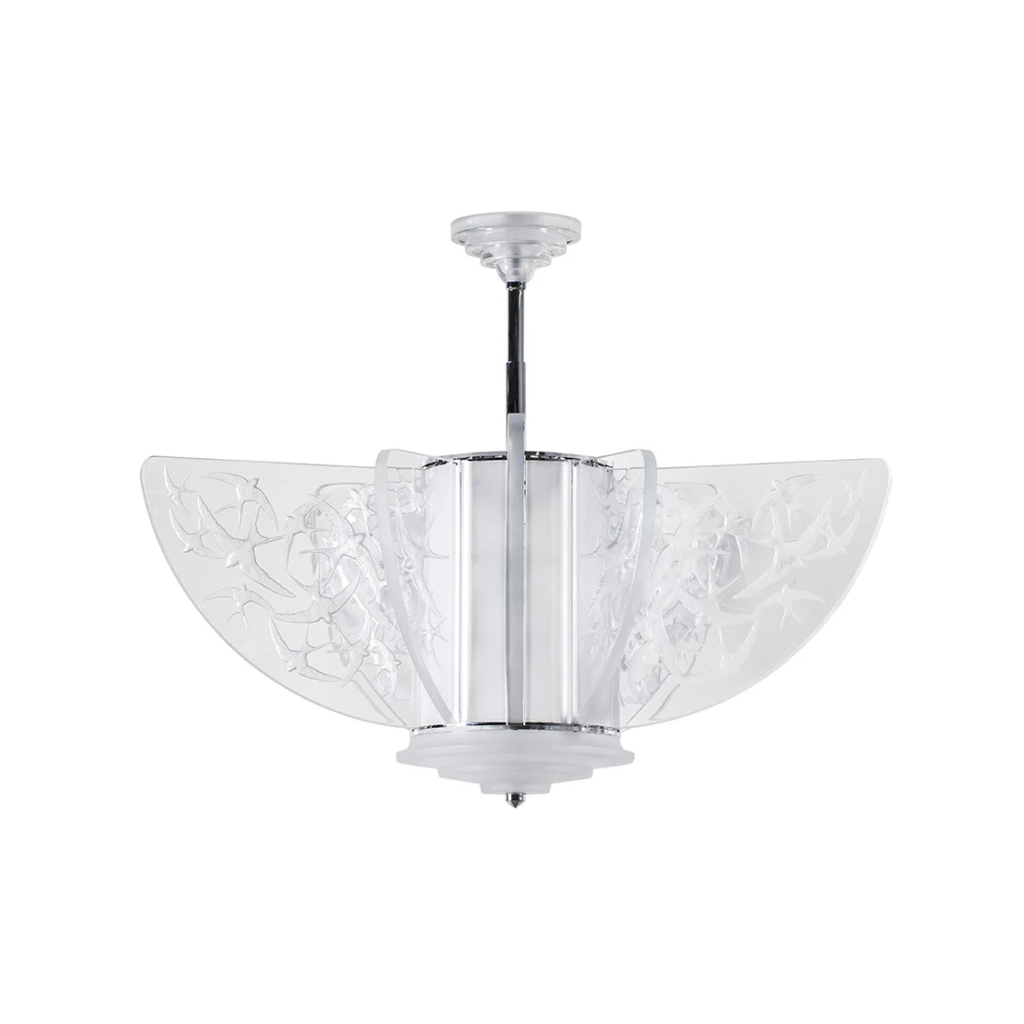 The Hirondelles Large Chandelier is a beautiful home accessory made by Lalique in crystal. Its distinct feature lies in the delicate depictions of swallows in flight, finely etched into the clear crystal, encircling the entire structure. Swallows, symbols of hope and good fortune, appear to dance in the air, creating a dreamy and timeless atmosphere. These figures, crafted with unparalleled mastery, reflect light in a play of refractions that enriches every environment with breathtaking luminous effects. It can be placed in a bedroom, living room, home entrance, or in elegant professional spaces like offices. This chandelier is a true artistic masterpiece capable of enhancing the ambiance, making it elegant and luxurious.