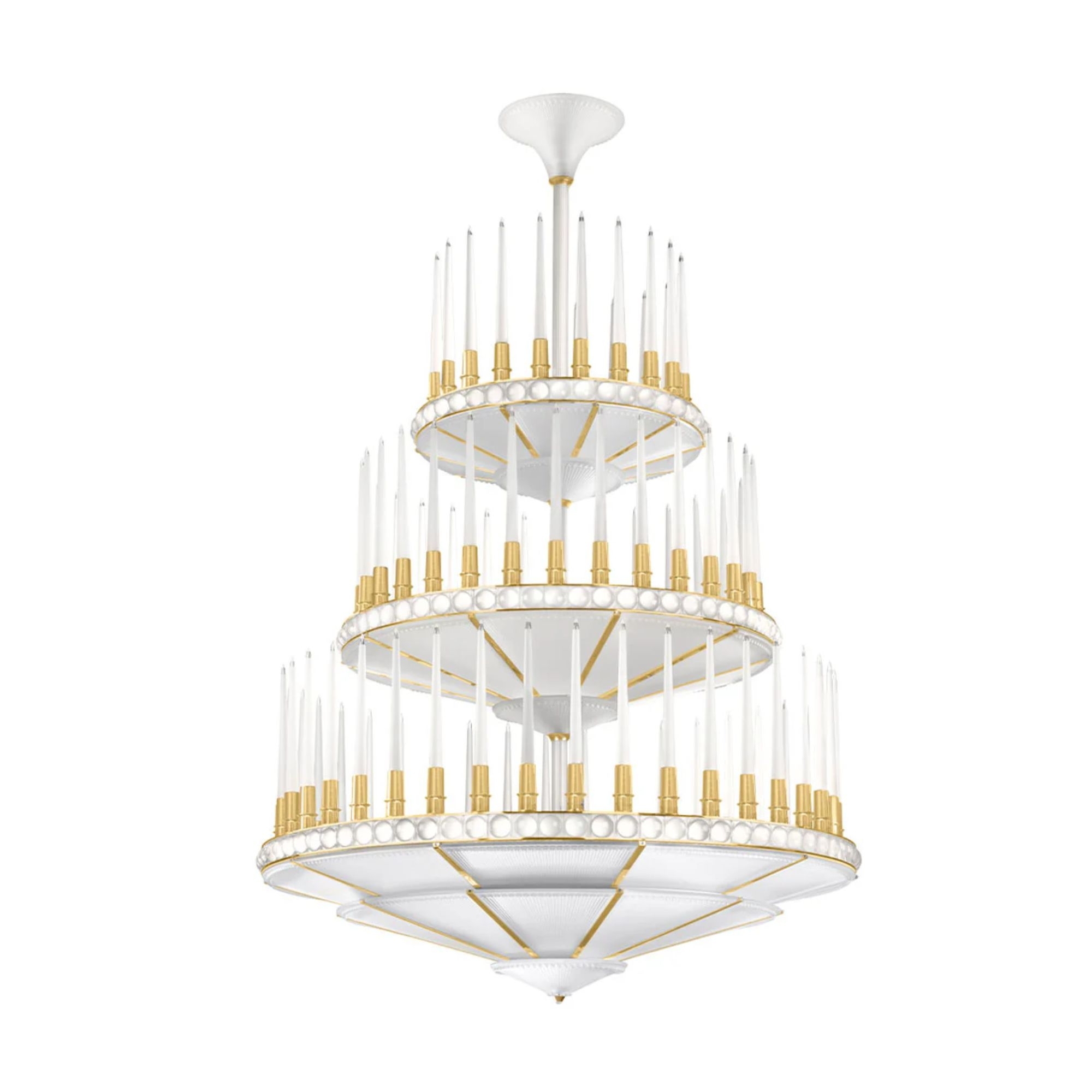 The Perles 3R Chandelier, with a diameter of 134 cm and a Gold Finish, was crafted by Lalique from crystal and metal, reflecting the luxury and sophistication that characterize the brand. Pierre-Yves Rochon found inspiration in the namesake lamps created by René Lalique in the 1930s and in the graphic and symbolic power of the candle. Across all cultures and religions, the candle is significant, synonymous with knowledge and the quest for truth. This chandelier showcases an elegant and contemporary design capable of elegantly enhancing any setting: whether it's placed within a professional studio, in domestic environments such as living rooms or hallways, or in commercial spaces, the Perles makes the atmosphere welcoming and relaxed, illuminating spaces in a uniform and cozy manner. Each chandelier is created through a process that requires precision and dedication, bringing to life a unique product that carries with it Lalique's signature and quality guarantee. Designed by Pierre-Yves Rochon for Lalique.