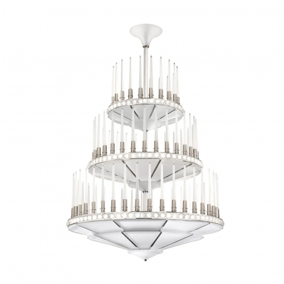 The Perles 3R Chandelier, with a diameter of 134 cm - Nickel Finish - has been crafted by Lalique from crystal and metal, reflecting the brand's characteristic luxury and sophistication. Inspired by the namesake lamps created by René Lalique in the 1930s, and the graphic and symbolic power of the candle, Pierre-Yves Rochon designed this masterpiece. In all cultures and religions, the candle holds significant meaning, symbolizing knowledge and the pursuit of truth. This chandelier features an elegant and contemporary design capable of stylishly enhancing any setting: whether placed within a professional studio, in home environments such as living rooms or hallways, or in commercial spaces, the Perles creates a welcoming and relaxed atmosphere, illuminating spaces in a uniform and cozy manner. Each chandelier is produced through a process demanding precision and dedication, resulting in a unique product that carries Lalique's signature and quality guarantee. Designed by Pierre-Yves Rochon for Lalique.