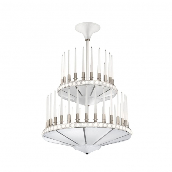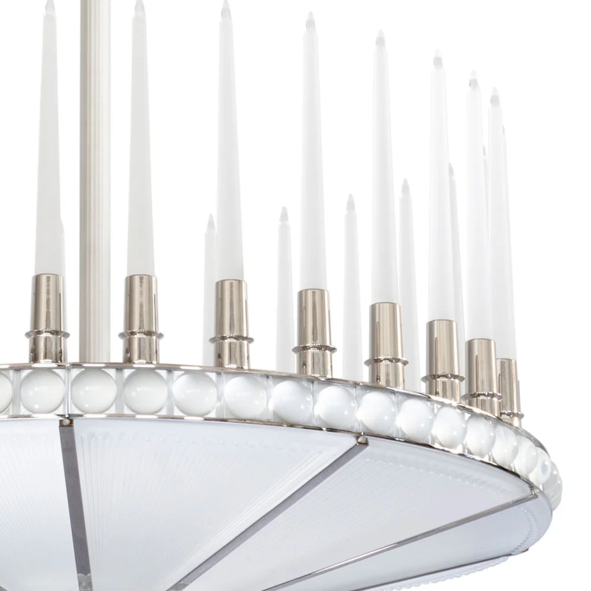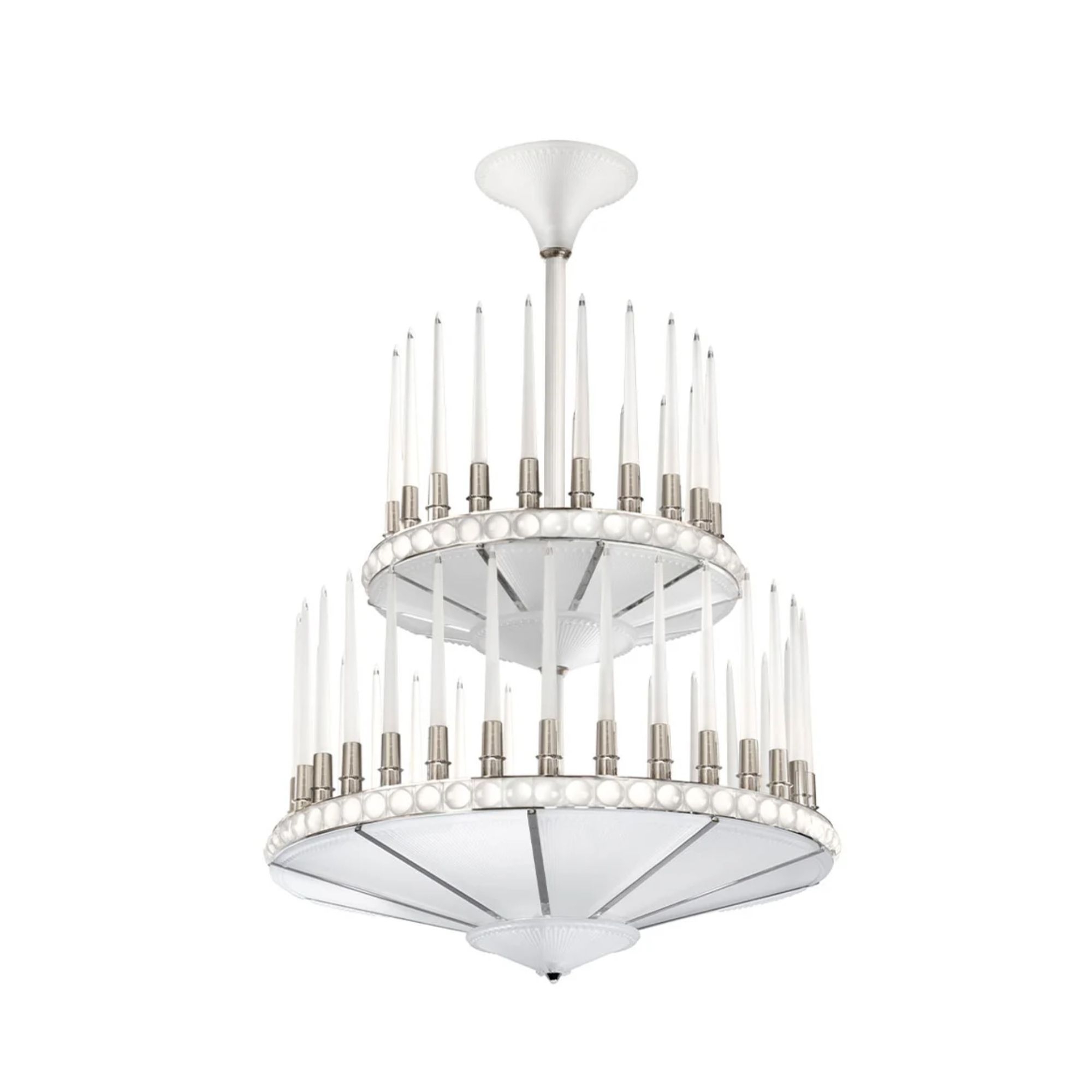 The Perles 2R Chandelier, with a diameter of 100 cm - Nickel Finish - has been crafted by Lalique from crystal and metal, embodying the luxury and refinement for which the brand is renowned. Pierre-Yves Rochon drew inspiration from the synonymous lamps created by René Lalique in the 1930s and the graphic and symbolic power of the candle. In all cultures and religions, the candle is significant, synonymous with knowledge and the quest for truth. This chandelier provides an elegant and contemporary design that stylishly enhances any setting: whether it is placed within a professional studio, in domestic settings such as living rooms or hallways, or in commercial spaces, the Perles makes the atmosphere inviting and relaxed, lighting spaces uniformly and warmly. Each chandelier is crafted through a meticulous process that requires precision and dedication, resulting in a unique product that carries the signature and quality assurance of Lalique. Designed by Pierre-Yves Rochon for Lalique.