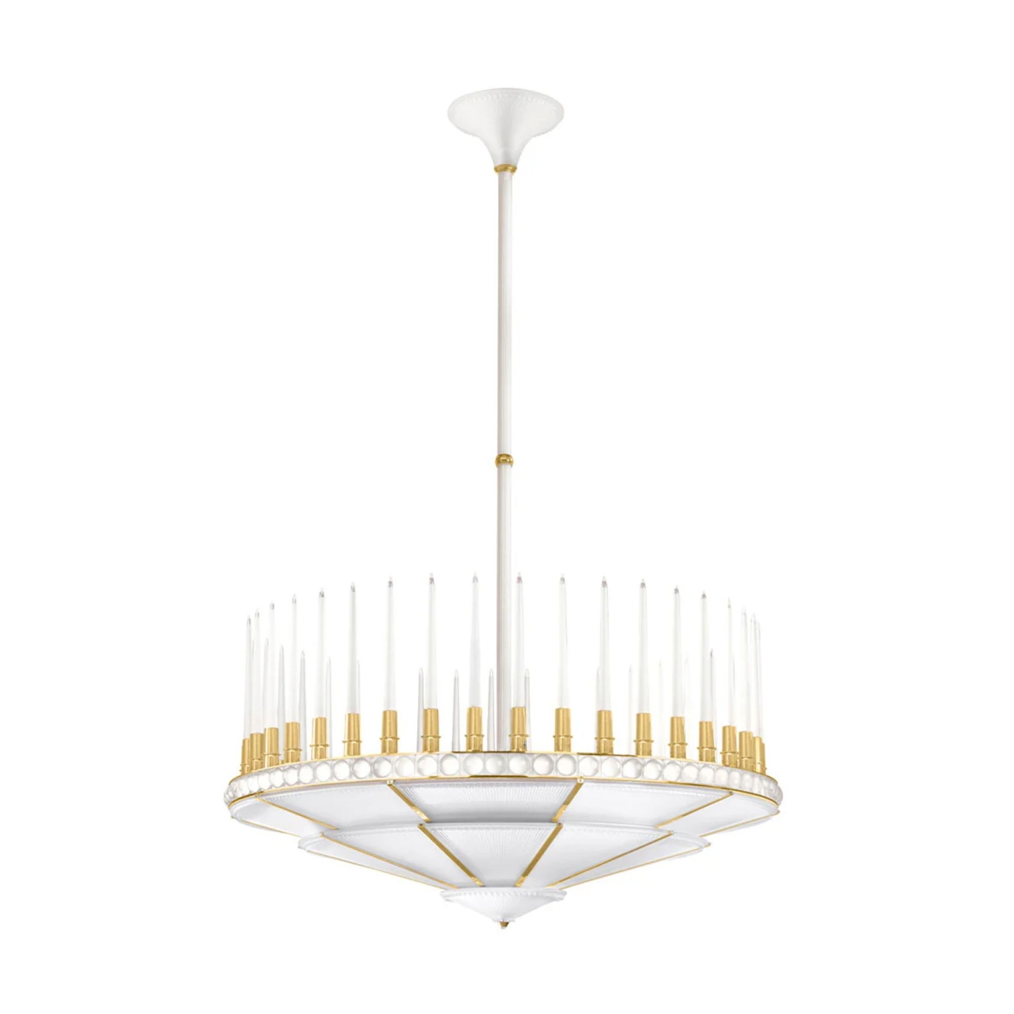 The Perles 1R Chandelier, with a diameter of 134 cm - Gold Finish - has been created by Lalique from crystal and metal, reflecting the brand's synonymous luxury and sophistication. Inspired by the namesake lamps made by René Lalique in the 1930s and the graphical and symbolic strength of the candle, Pierre-Yves Rochon designed this piece. Across all cultures and religions, the candle is significant, symbolizing knowledge and the pursuit of truth. This chandelier features an elegant and contemporary design that stylishly enriches any environment: whether positioned inside a professional studio, in domestic contexts such as living rooms or hallways, or in commercial spaces, the Perles sets an inviting and relaxed atmosphere, illuminating spaces uniformly and warmly. Each chandelier is crafted through a process that demands precision and dedication, resulting in a unique product that carries with it Lalique's signature and guarantee of quality. Designed by Pierre-Yves Rochon for Lalique.
