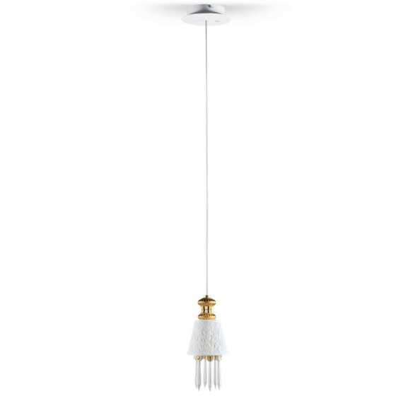 The Belle de Nuit Lito Gold pendant lamp is a stunning creation by Lladró, featuring porcelain pendants and handcrafted design. It represents a wonderful expression of modern decorative art, combined with the tradition of high-quality porcelain. The design is inspired by the "Bella di Notte" plant, a plant whose petals reflect moonlight, gaining the magical ability to glow in the darkness. Whether placed in an office, living room, kitchen, or in commercial spaces, the Belle de Nuit Lito Oro pendant lamp is capable of creating a cozy and warm atmosphere. It is perfect for anyone wishing to add a touch of modern elegance and a splash of vibrant color to their home or office.