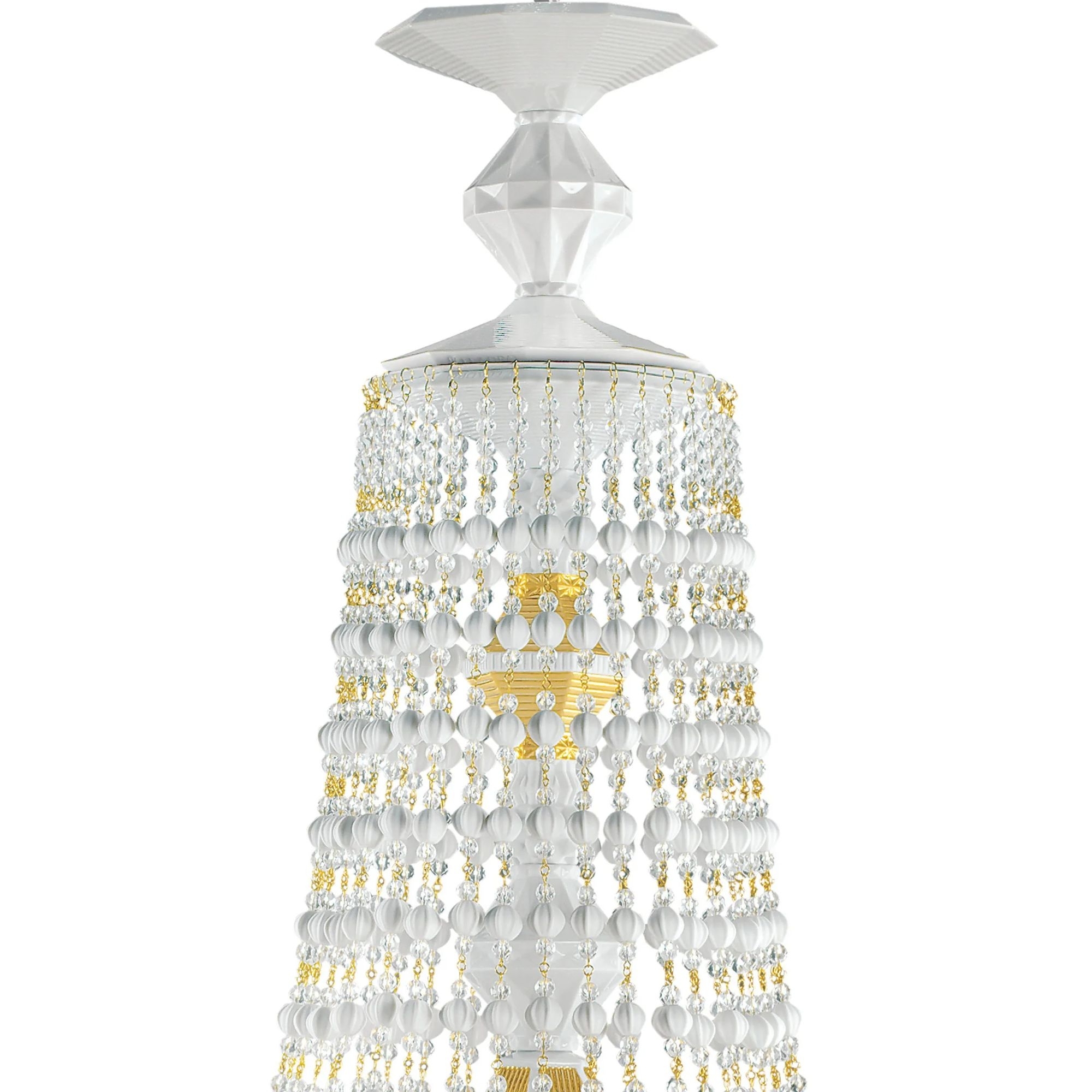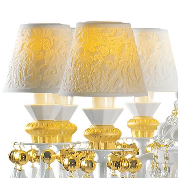 Winter Palace 12-light chandelier made of white-gold metal and translucent porcelain. This pendant lamp, featuring a white metal structure with luxurious golden finishes, is adorned with beautiful translucent porcelain tulips that spread a warm and welcoming light in every room. Perfect for those seeking a touch of class and sophistication, the Winter Palace chandelier transforms any space into a regal salon of beauty and comfort. Suitable for elegant settings, this exclusive piece of furniture is not just a light source, but a work of art that enriches your home's decor with timeless charm.