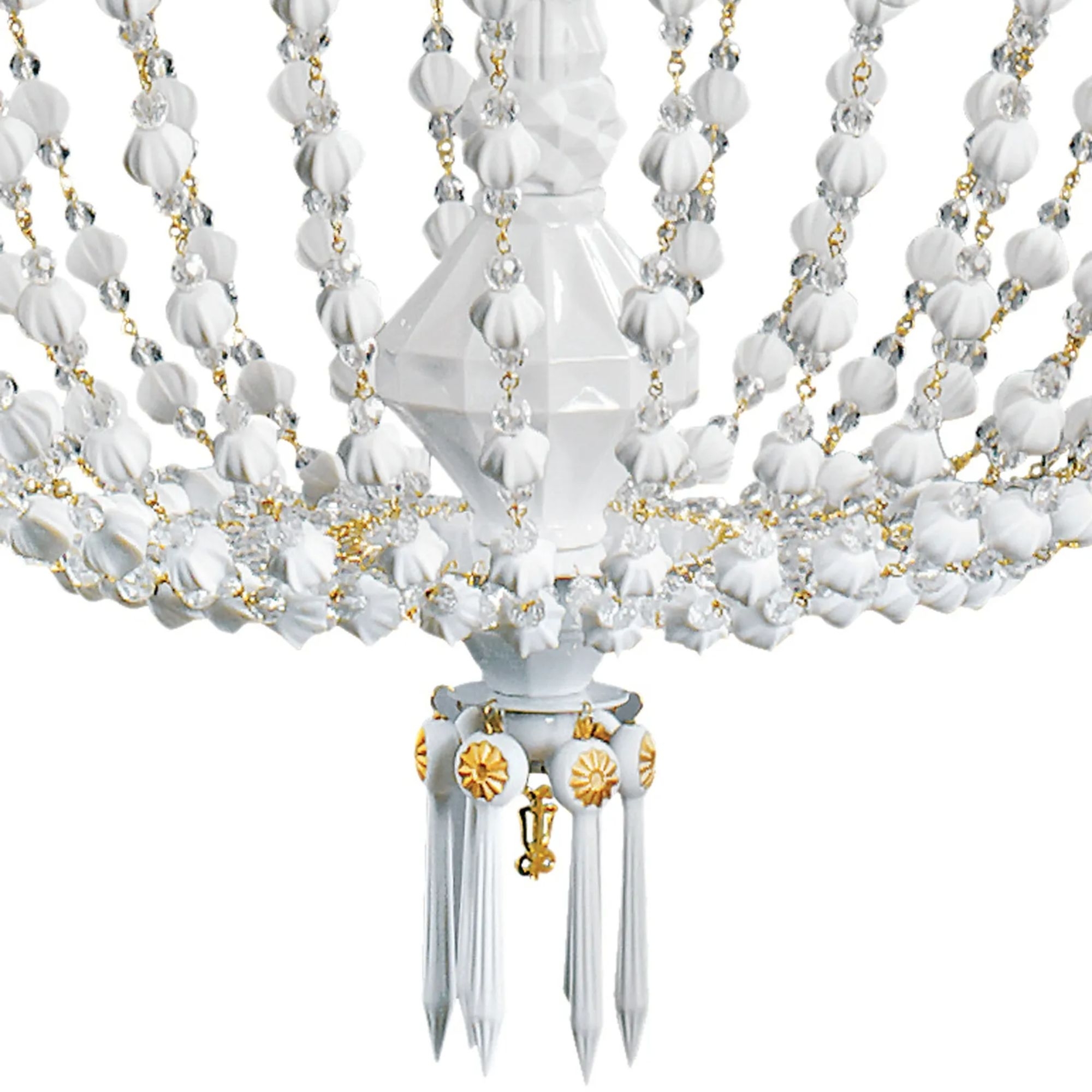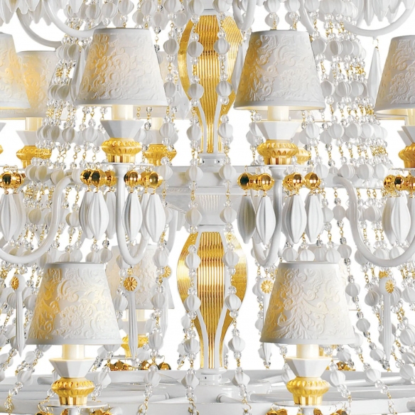 Winter Palace 30-light chandelier made of white-gold metal and translucent porcelain. This suspension lamp, featuring a white metal structure with luxurious golden finishes, is adorned with stunning translucent porcelain tulips that cast a warm and welcoming light throughout any room. Perfect for those in search of a touch of class and sophistication, the Winter Palace chandelier transforms any space into a regal salon of beauty and comfort. Ideal for elegant environments, this exclusive piece of furniture is not merely a source of light but a work of art that enhances your home's decor with an enduring allure.