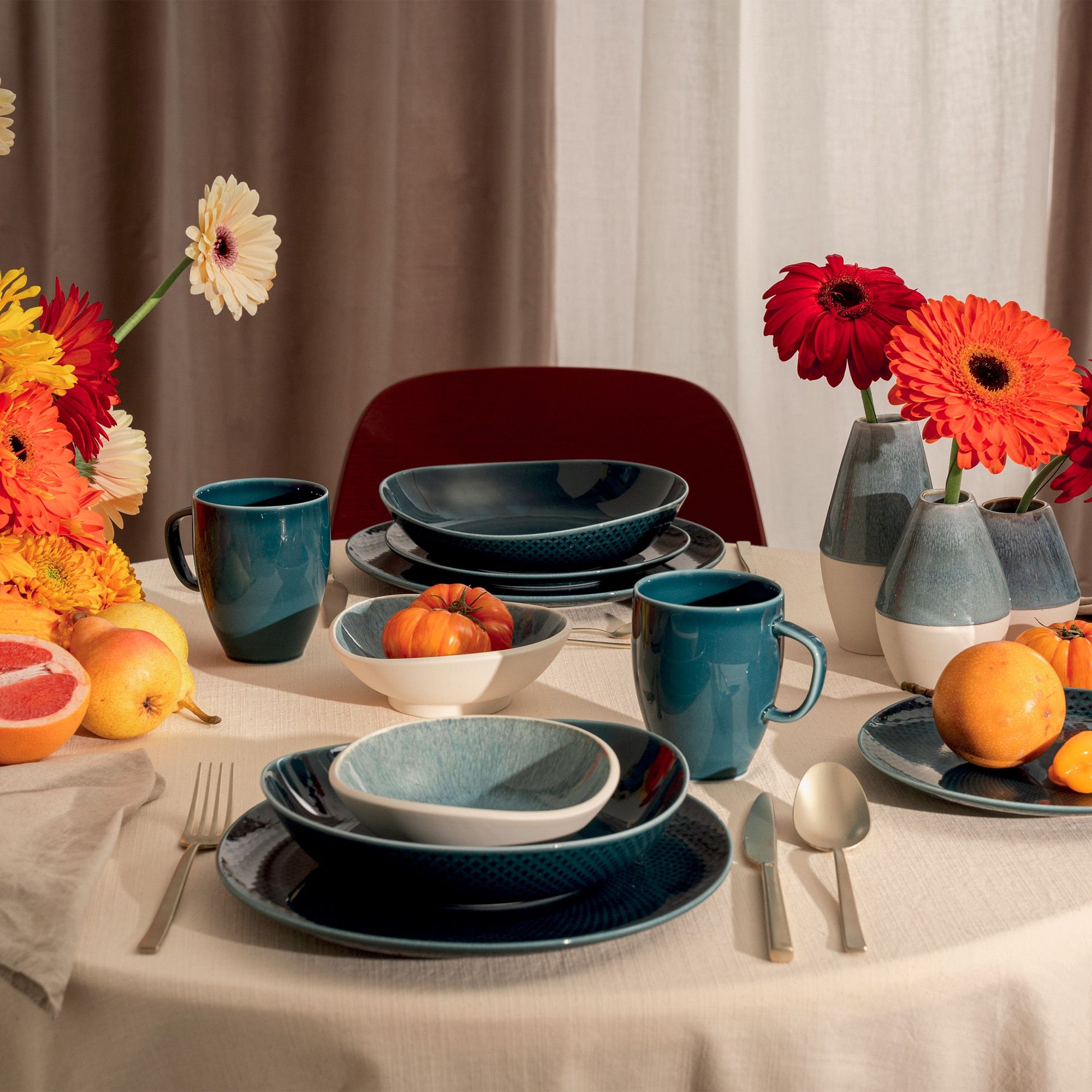 The Junto collection skilfully combines materials of exceptional quality and sensual textures: fine porcelain, soft and welcoming ceramic and warm wood intertwine in a delicate aesthetic balance. This fusion of materials allows for a surprising variety of combinations, making each table unique and exclusive, ready to welcome any type of culinary culture with elegance and style. The distinctive design of this collection is manifested in the refinement of the fine porcelain, characterized by a delicate diamond relief that gradually becomes thinner towards the center, adding a touch of refinement and brightness to each component of the set. In perfect contrast, the solid and earthy stoneware, accentuated by a special reactive glaze, makes the stoneware pieces robust and visually fascinating, offering a unique tactility and rustic beauty that blends harmoniously with the delicacy of the porcelain. Available in 3 colors. Made by Rosenthal.