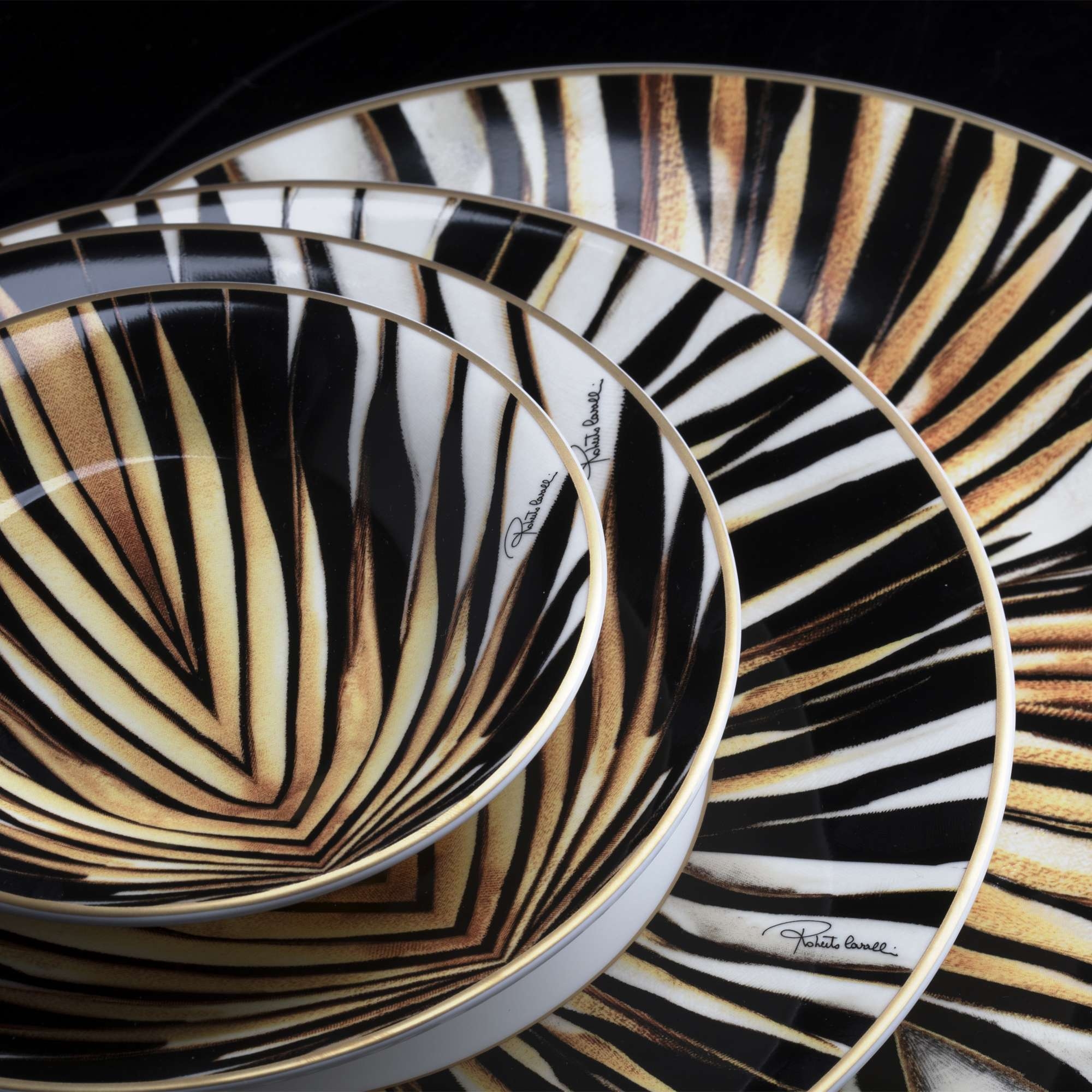 The Ray Of Gold set of 6 dessert plates, with a diameter of 21.5 cm, is a beautiful masterpiece for your kitchen created by Roberto Cavalli in Bone China porcelain, a material admired for its remarkable durability and elegance. This set of 6 dessert plates is marked by an animalier design with a black and gold rim. Matching with modern, casual, or classic table settings, Ray Of Gold becomes a design set that captures guests' attention in a unique way. The Ray Of Gold set is the ideal choice for those who want to add a touch of luxury to their kitchen or dining room, making the act of eating a magnificent and unforgettable event. The set of 6 dessert plates is sufficiently versatile to be used for both formal occasions and to enhance the daily routine, showing that high-range design can go hand in hand with practicality. Buy this sophisticated set right here, on Newpop.it!