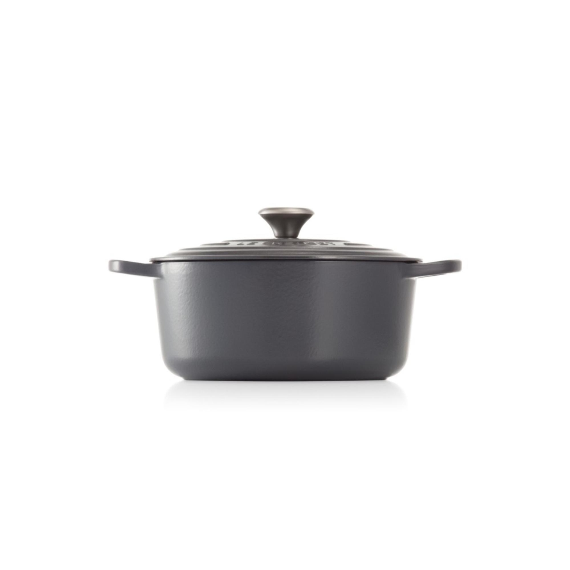 Cocotte Evolution round vetrified cast iron casserole with a diameter of 24 cm available in 10 color finishings: Cherry, Matt Black, Orange, Marsiglia blue, Meringue, Deep Teal, Caribe blue, Yellow, Mist grey and Shell pink, made by Le Creuset.