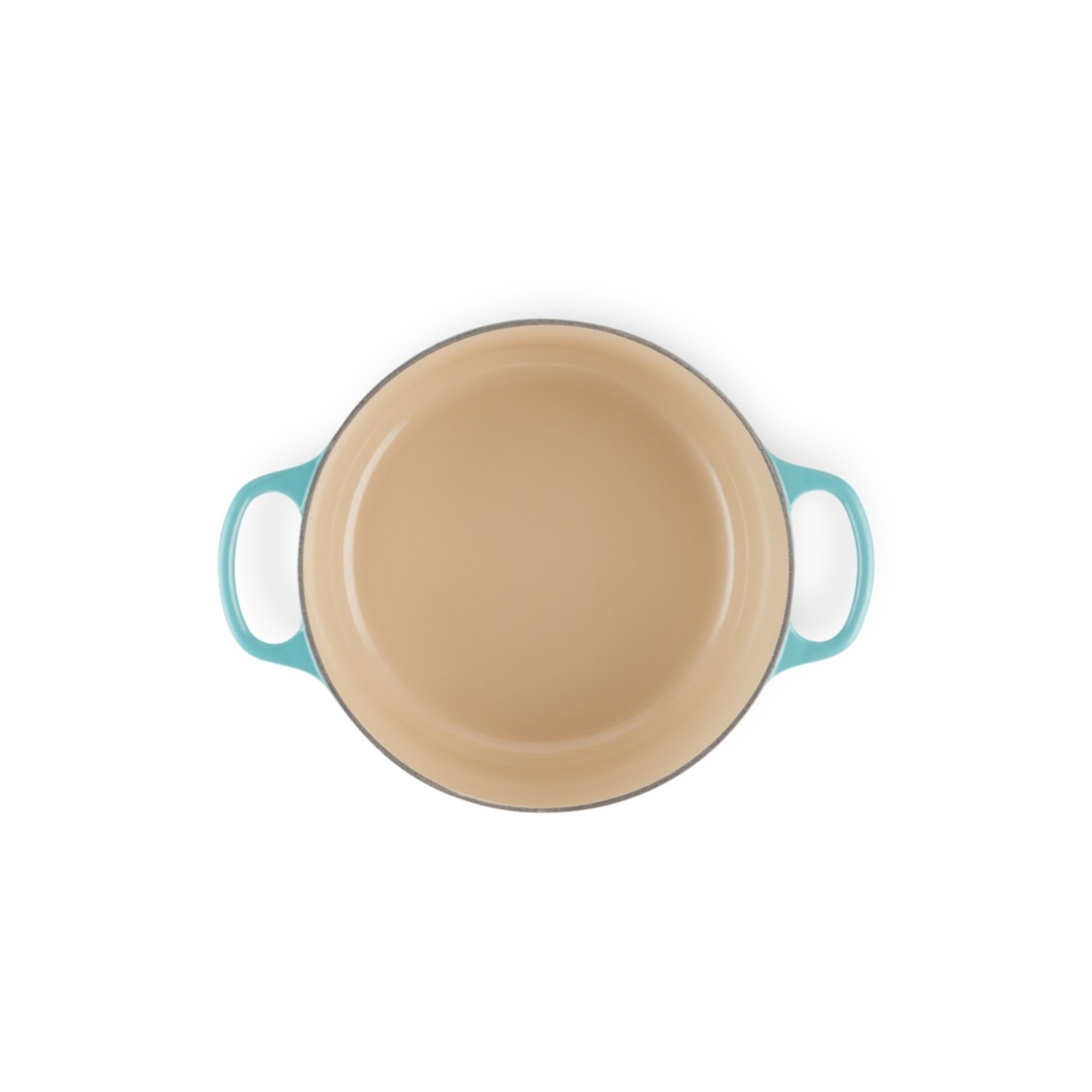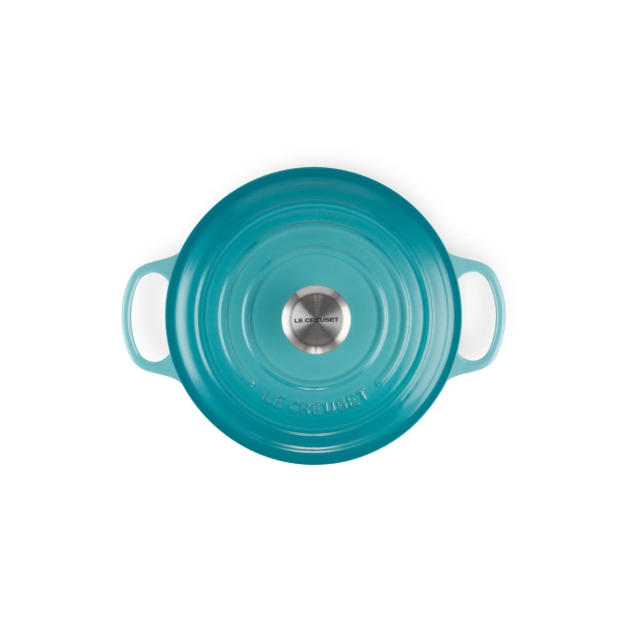 Cocotte Evolution round vetrified cast iron casserole with a diameter of 24 cm available in 10 color finishings: Cherry, Matt Black, Orange, Marsiglia blue, Meringue, Deep Teal, Caribe blue, Yellow, Mist grey and Shell pink, made by Le Creuset.