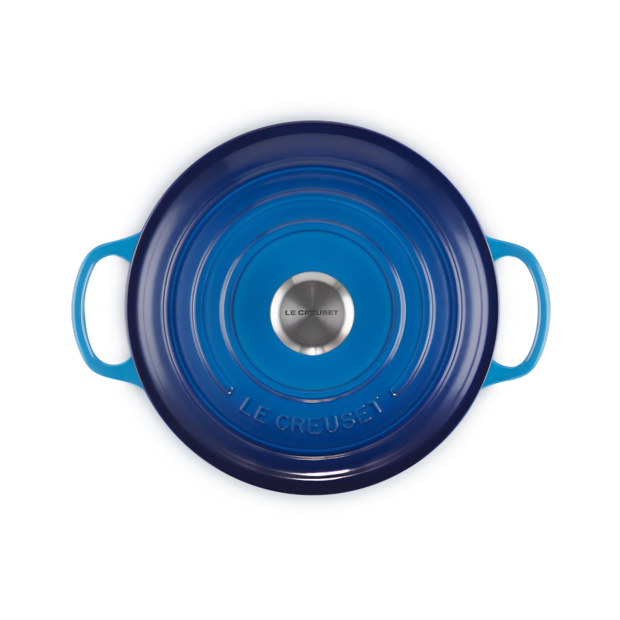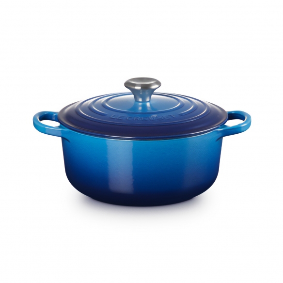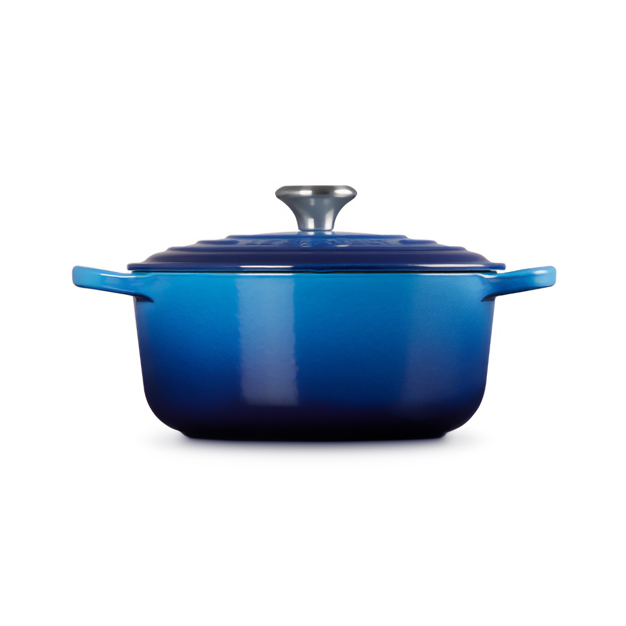 Evolution vitrified cast iron round Cocotte casserole. It comes in a selection of 4 color finishes: Matt Black, Cherry, Orange and Marseille Blue, made by Le Creuset.