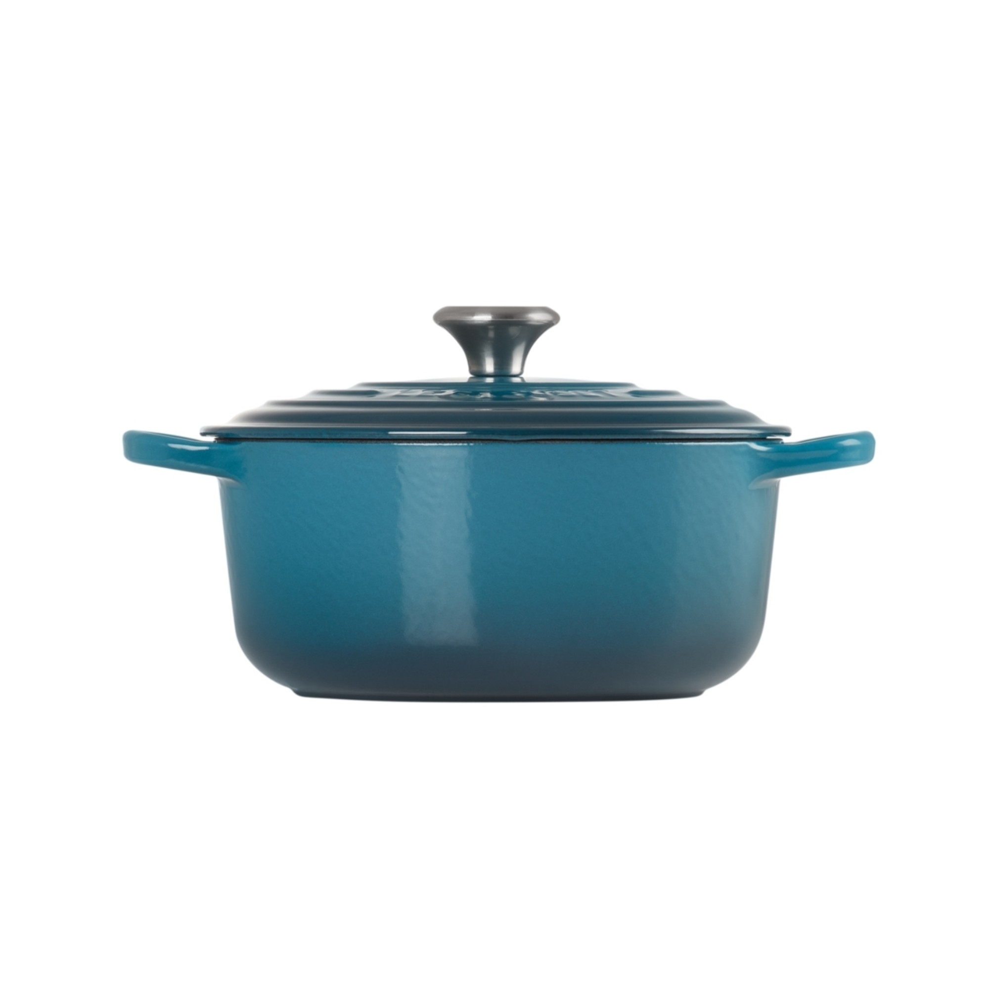 Evolution vitrified cast iron round Cocotte casserole. It comes in a selection of 4 color finishes: Matt Black, Cherry, Orange and Marseille Blue, made by Le Creuset.