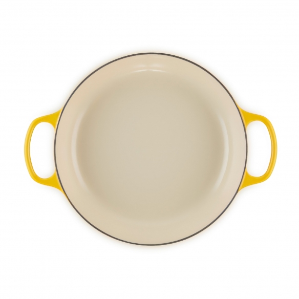 Evolution low round pan ( diam. 26 cm) made of vitrified cast iron, enamelled both outside and inside. The flattened shape and shallow sides make it perfect for browning meat or vegetables, for simmering or in the oven. This pan is part of the exctensive cast iron collection created by Le Creuset, which has become a modern day culinary icon. The high-quality vitrified cast iron, strong point of the brand since the very beginning, enhances the flavour of your favourite creations, while the special handles make it comfortable and easy to grip. Choose the uniqueness, the quality and the attention to details of Le Creuset!