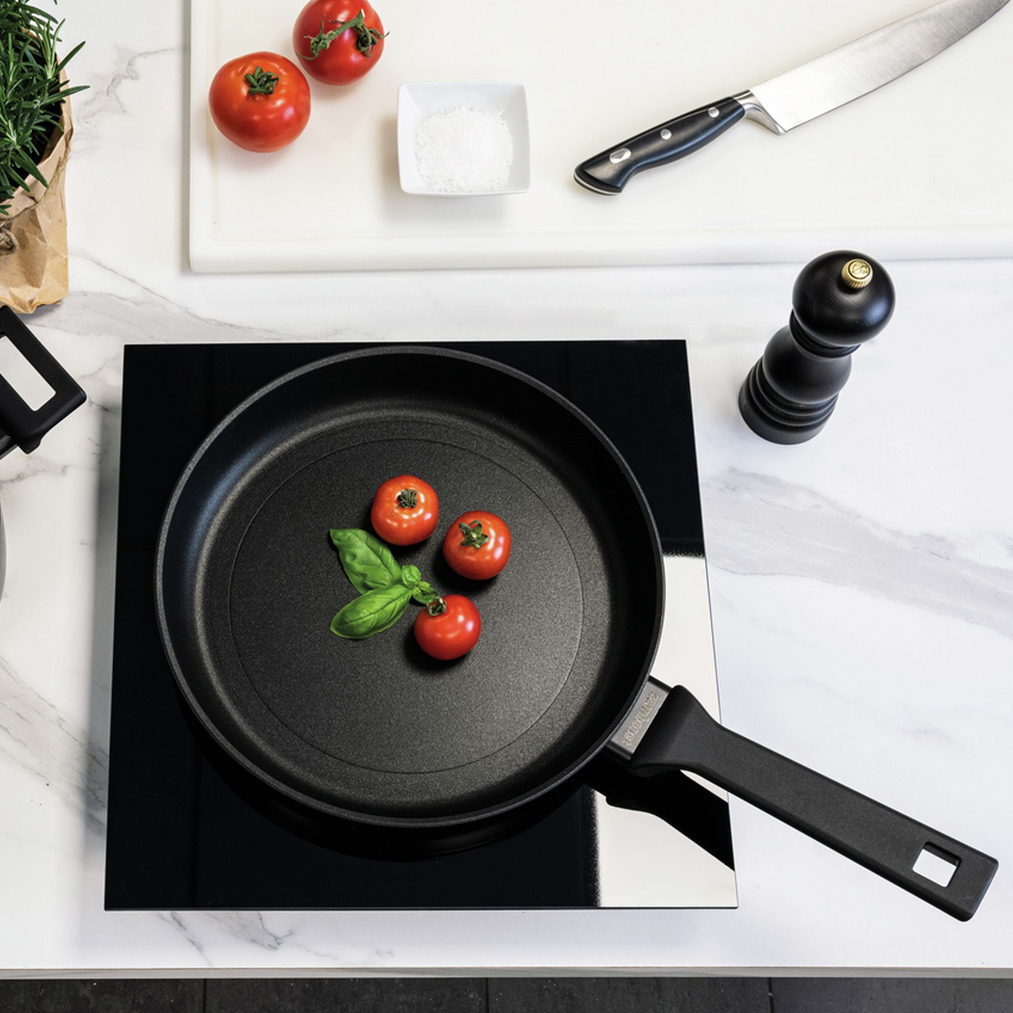 Titan Pro pan diam. 30 cm in non-stick aluminum with double induction system and coating composed of two stainless steel discs, a titanium layer with diamond powder finish and highly resistant mineral particles, bakelite handle and ultra-flat bottom to offer strength and stability during use and perfect for quick and uniform cooking of various culinary preparations with the advantage of having a scratch-resistant, stain-resistant surface that is resistant to natural food acids and suitable for washing in the dishwasher. Designed and manufactured by Sambonet.