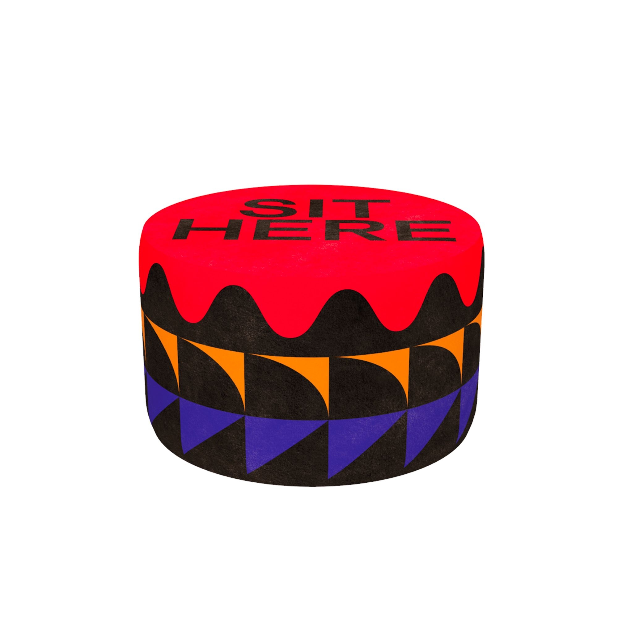 The Oggian Sit here Red M pouf, crafted by Qeeboo from polyurethane and polyester fabric, is an exceedingly soft seating option that ensures comfort, durability, and resistance, suitable for daily use. This unique piece of furniture, with its distinctive geometry and vibrant colors on a black and red background, turns into a phenomenal addition that fits into any environment, whether it be a living room, bedroom, or home office. Adorned with the phrase "SIT HERE," it encourages users to try it and enjoy its comfort. Besides its whimsical beauty, the Oggian Sit here Red M pouf is a model of comfort. Though visually lightweight, its structure is designed to provide adequate support, making the pouf perfect for relaxation moments or for welcoming guests in a personalized and comfortable manner. Its ample size makes it suitable both as a standalone seat and as an additional footrest. Designed by Marco Oggian for Qeeboo.