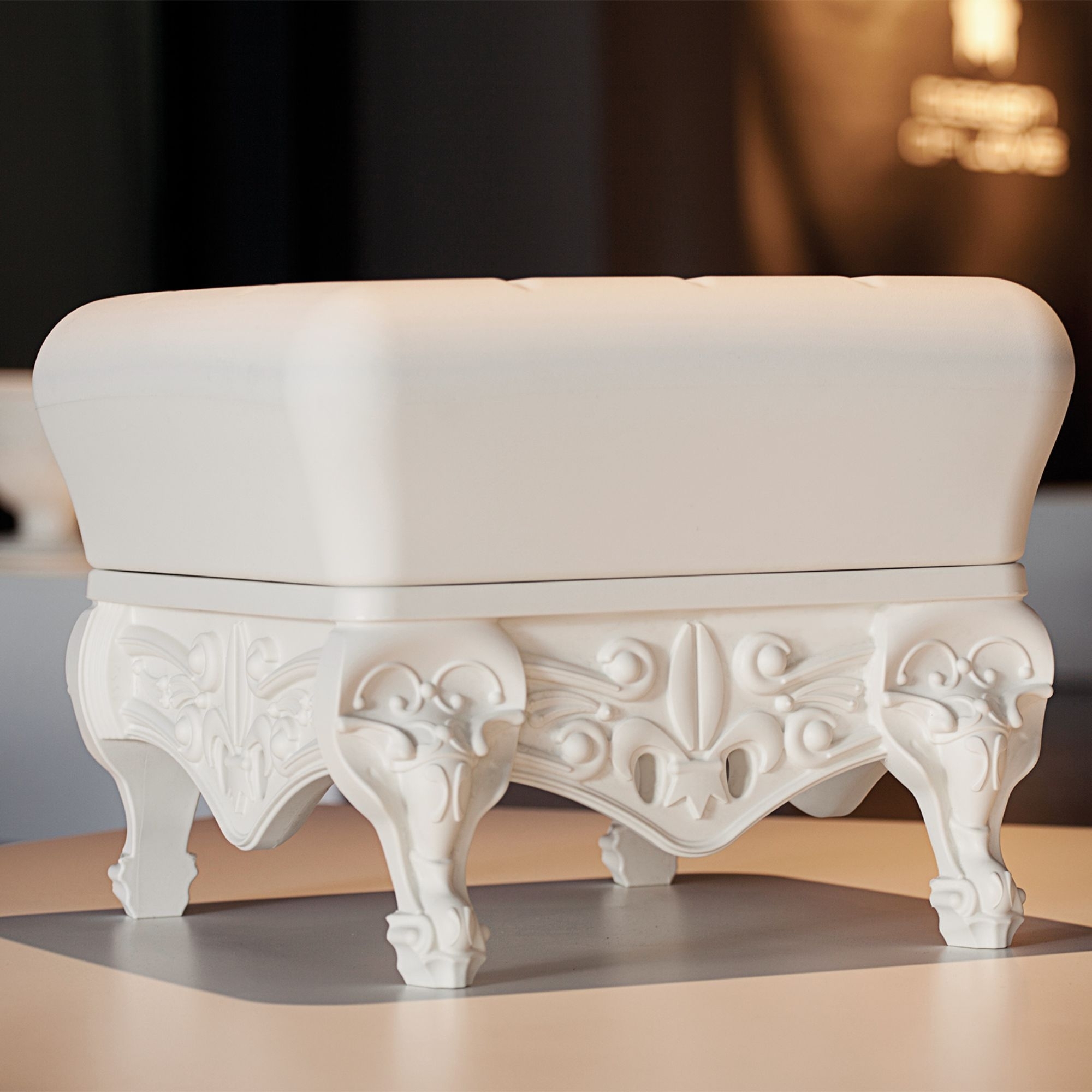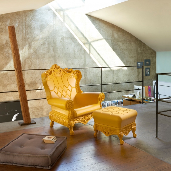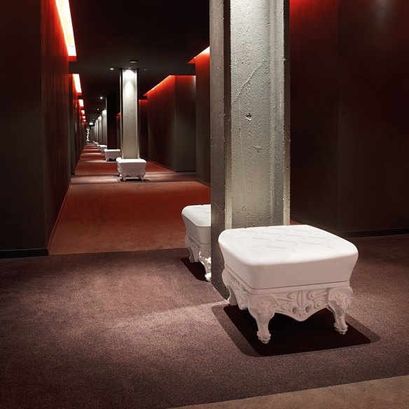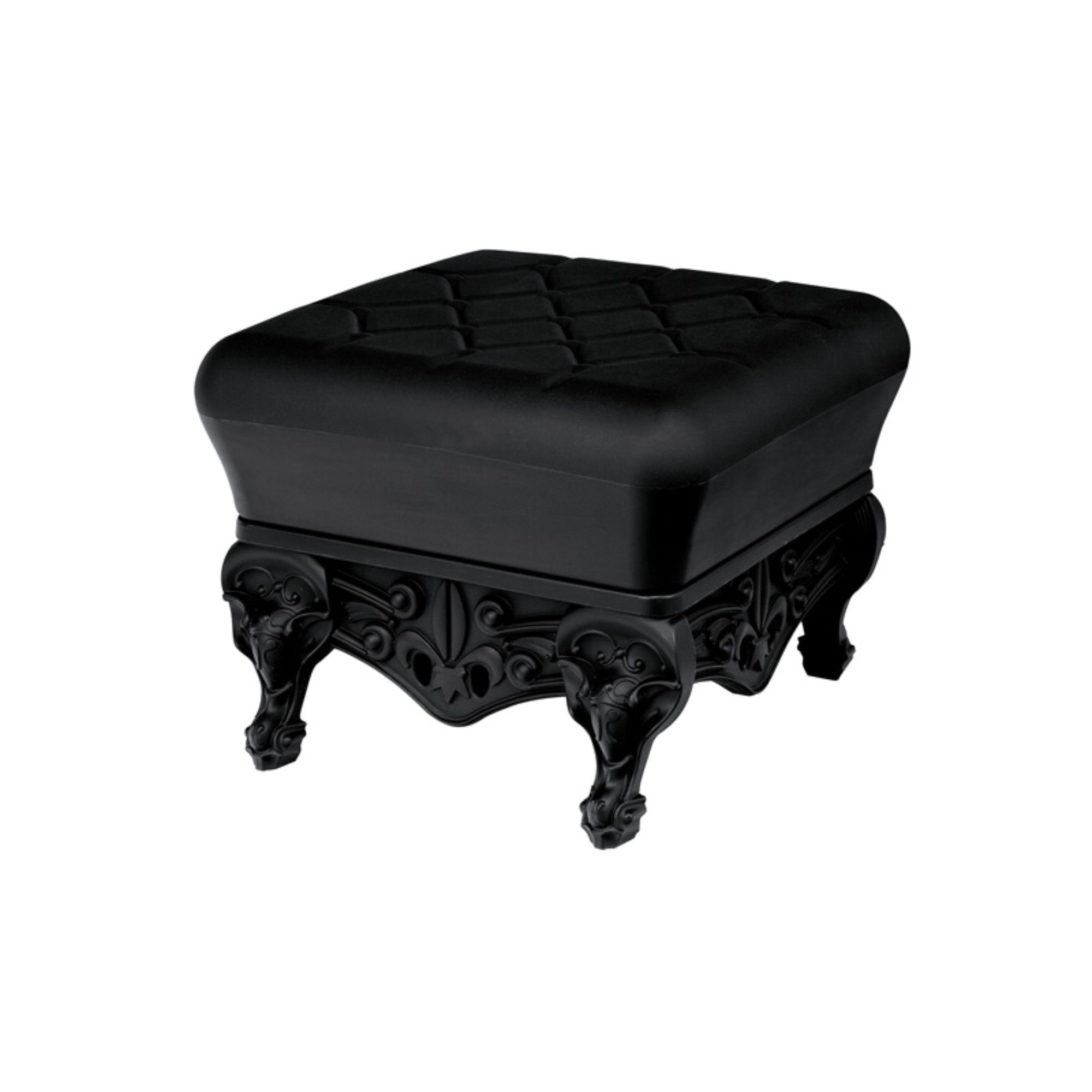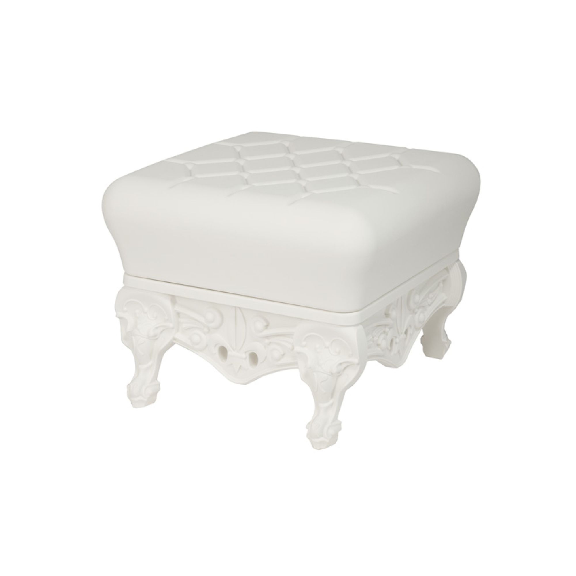 Little Prince of Love is a pouf that embodies the ironic and pop spirit of the entire Design Of Love collection, made by Slide entirely from 100% recyclable polyethylene, a material valued and admired for its versatility and durability. This iconic pouf features rich, detailed legs typical of baroque style, and thanks to its beautiful color palette, it can complement any decor context, from modern to classic. Whether placed in a bedroom, living room, waiting area, or commercial office, Little Prince of Love offers comfort and inspires design and innovation. Additionally, this pouf is the perfect complement to the Queen of Love armchair: together they create a regal and elegant atmosphere. Lightweight and easy to clean, the Little Prince of Love pouf is a piece of furniture that blends elegance, functionality, and innovation. Design by Moro & Pigatti for Slide.