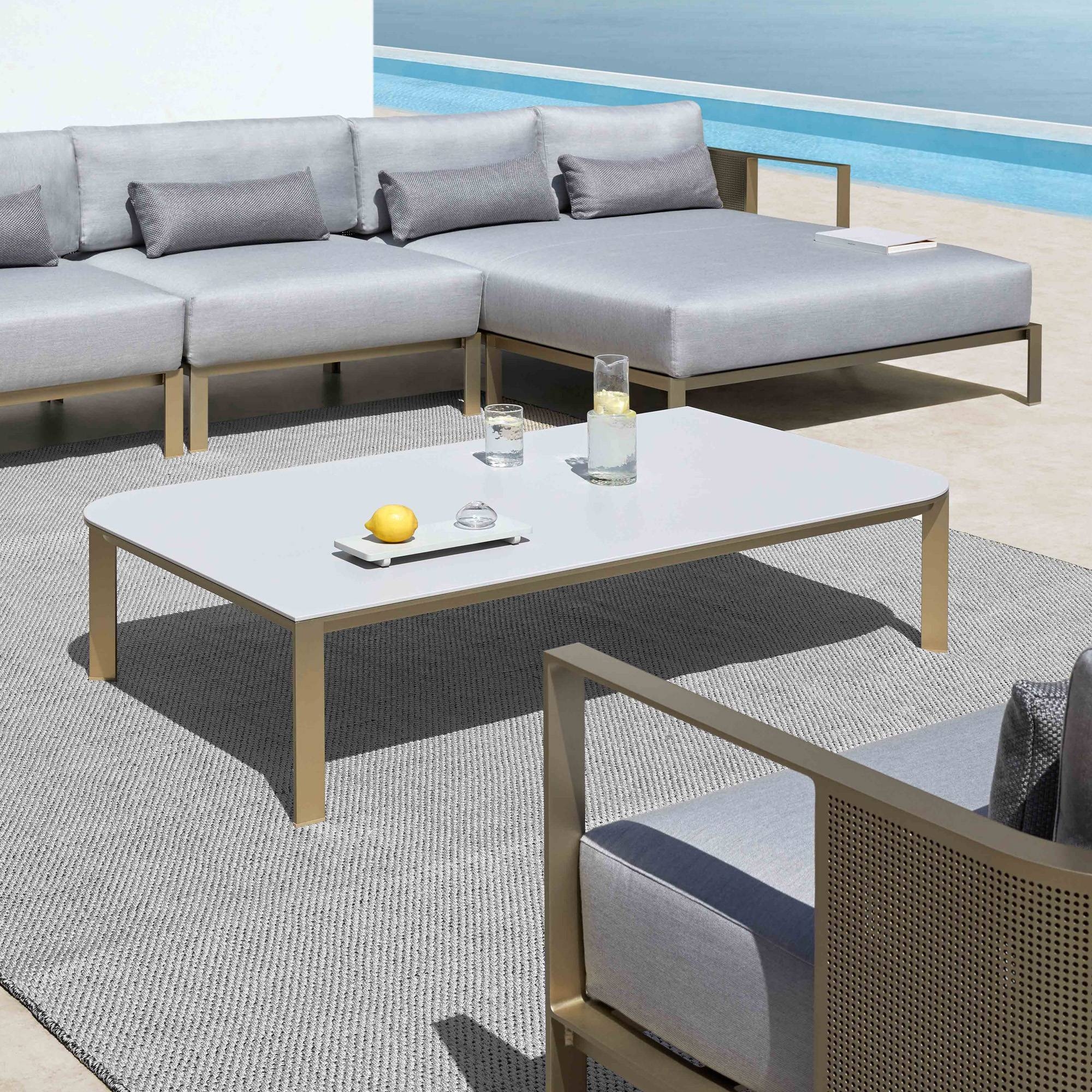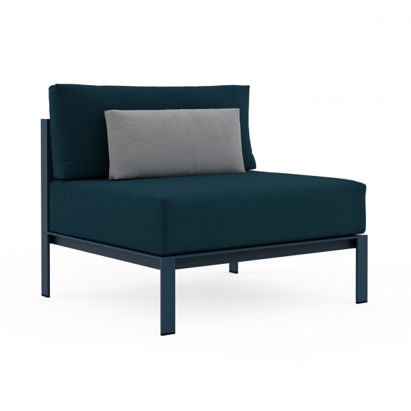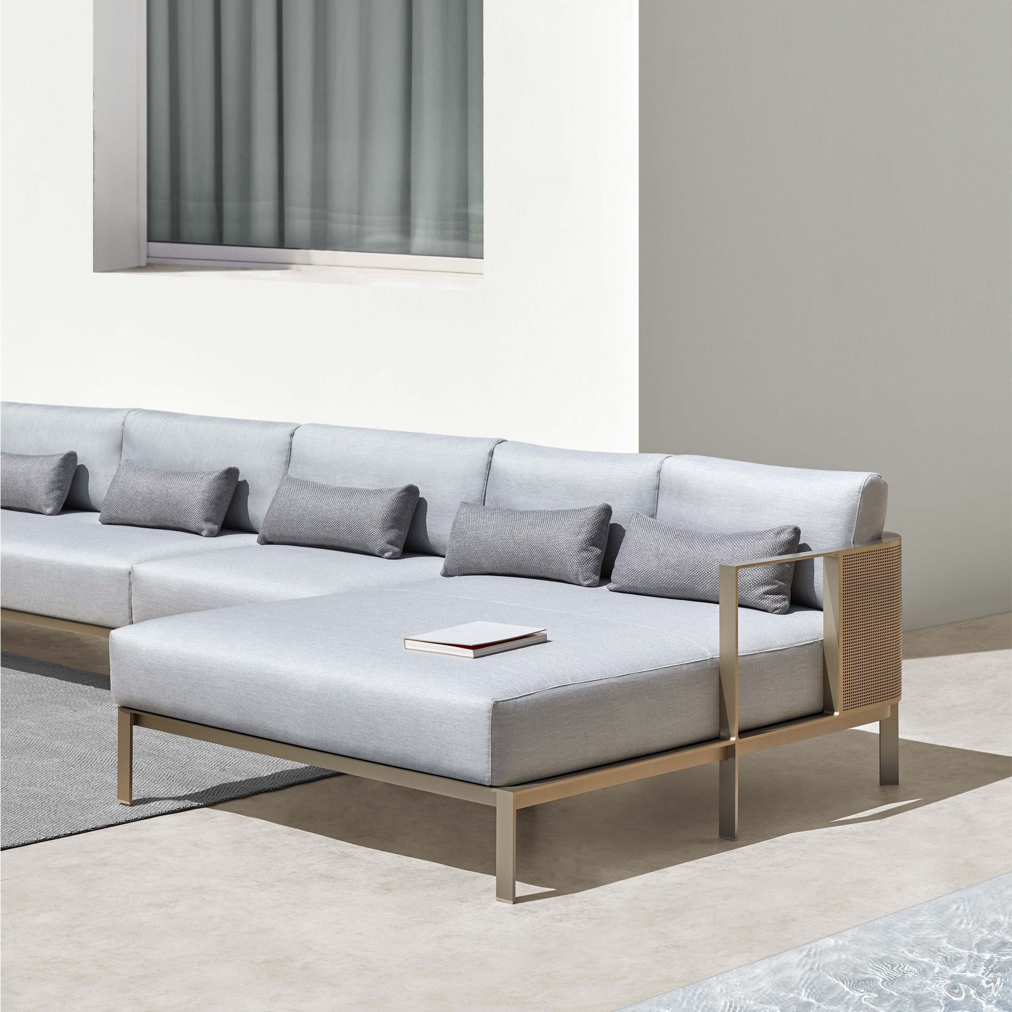 Solanas modular sofa 3 - open section with powder-coated aluminum structure and micro-perforated sheet metal, armrests in Dekton® by Cosentino, back and seat cushion with foam padding and water-repellent fabric covering and perfect for adding extra seats in a outdoor relaxation area with style, quality and durable materials resistant to UV rays and low temperatures. Designed by Daniele Germani for Gandía Blasco.