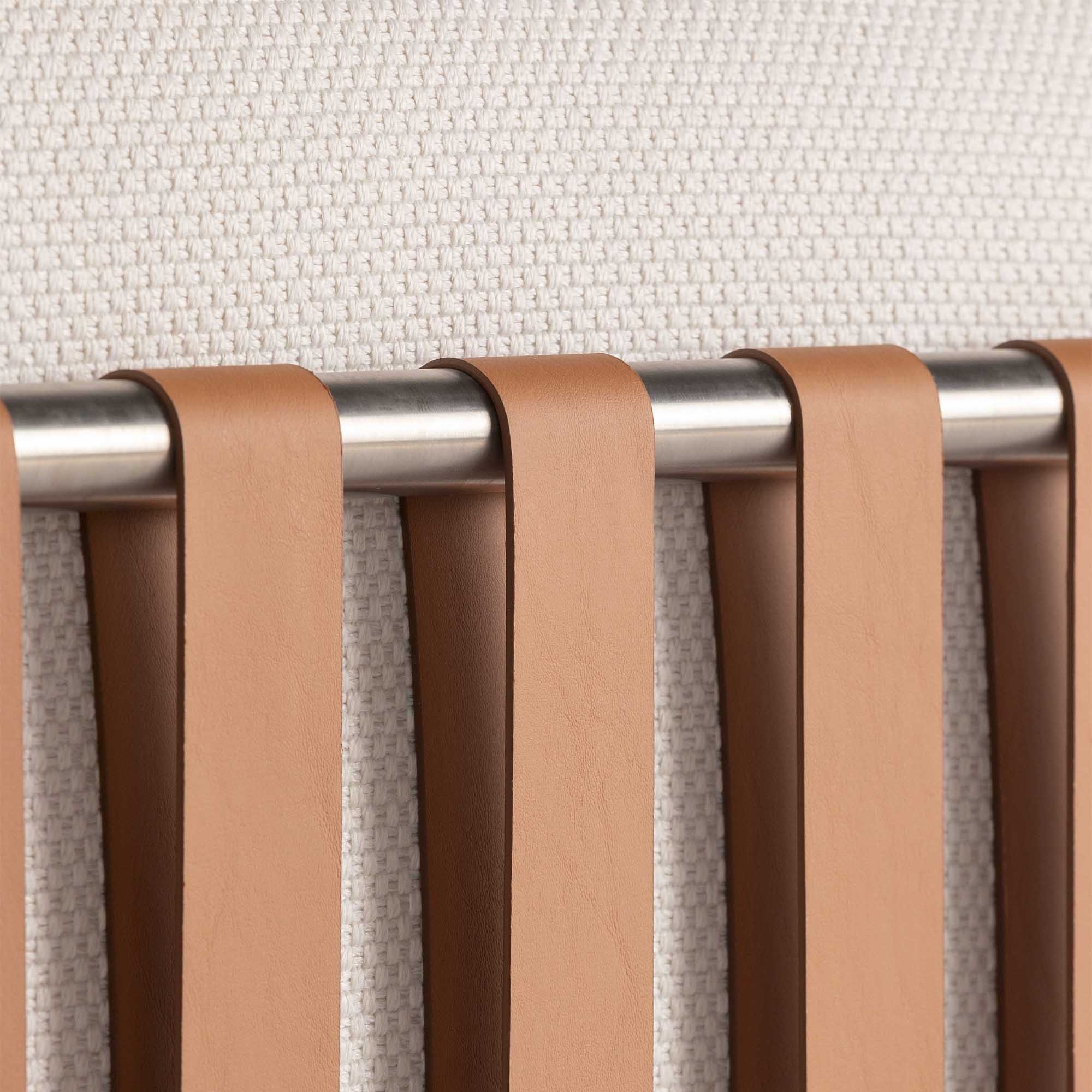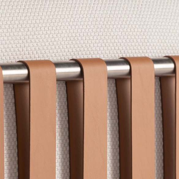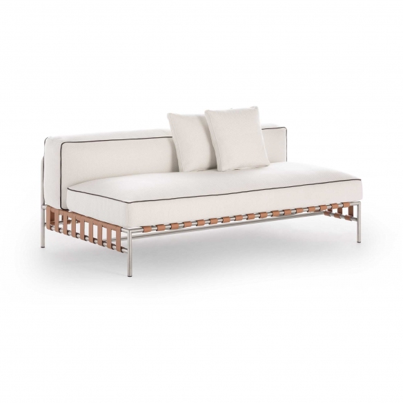 Onsen modular sofa 4 with structure in satin finish AISI 316L stainless steel with low carbon content and resistant to corrosion and oxidation, straps in synthetic leather, vinyl and polyester, seat and back cushions with polyurethane foam padding covered in water-repellent fabric, cord in 100% acrylic fabric and perfect for lying down and relaxing in the comfort of a home garden or an outdoor area of a resort or bristrot. The sofa has removable covers. Designed by Francesco Meda and David Quincoces for Gandía Blasco.