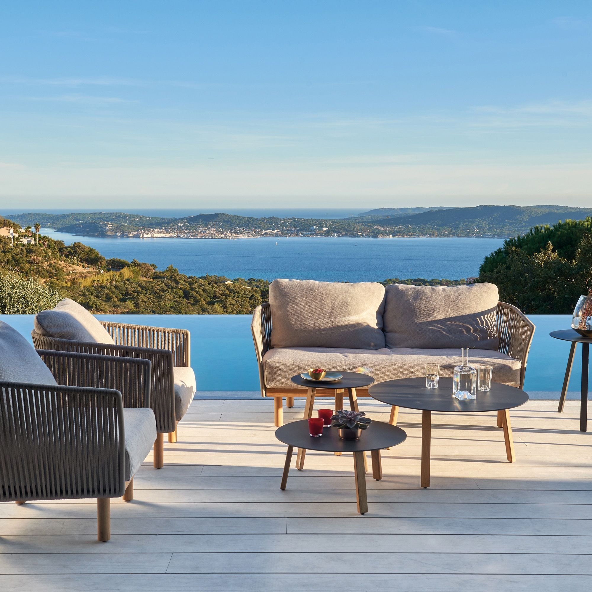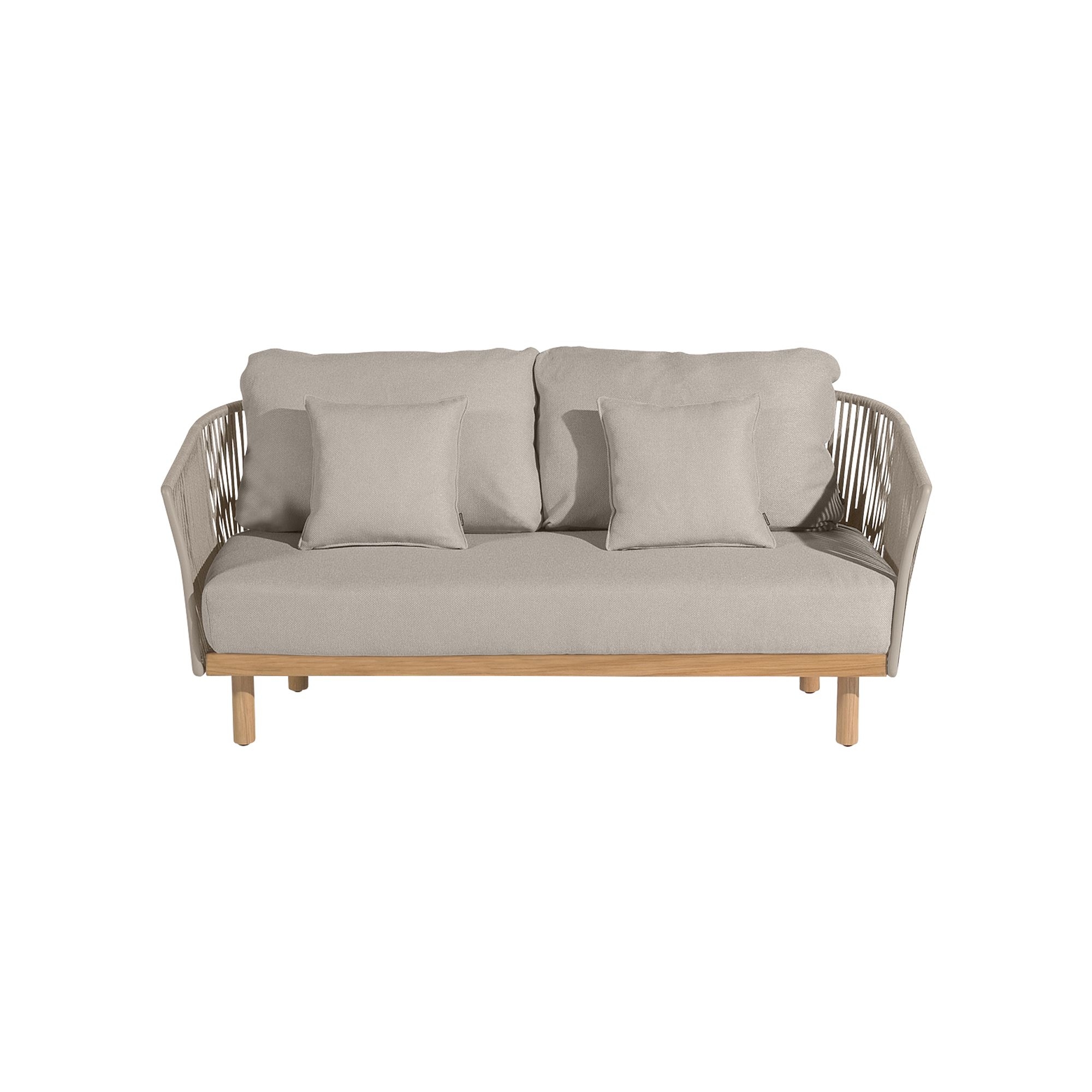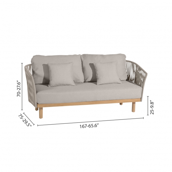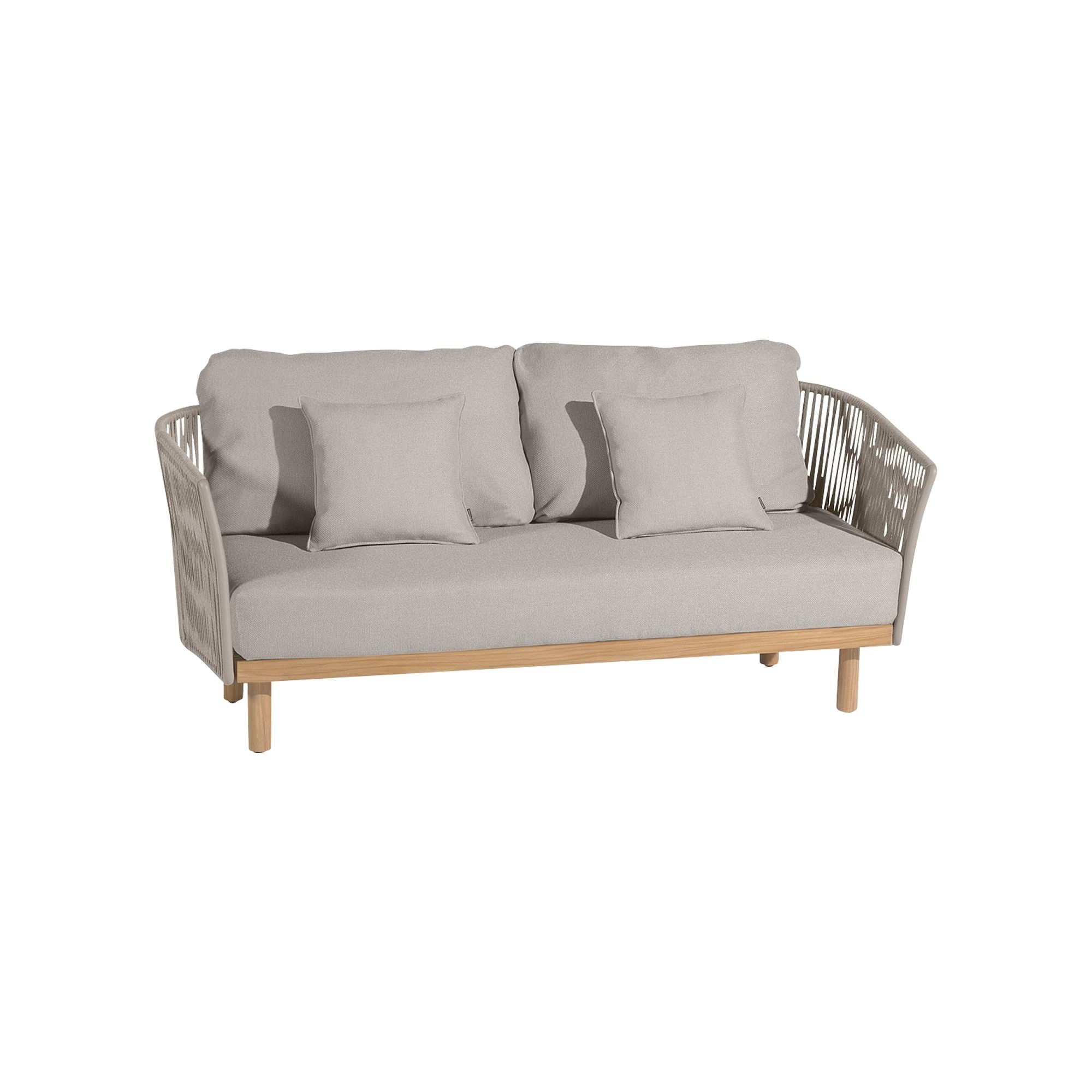The Newport 2-seater sofa with cushions features a robust aluminium framework, interwoven straps, and Teak wood which collectively conjure a luxurious ambiance for any setting. Whether it's in contemporary design contexts or in traditional outdoor spaces, it maintains a refined identity. The Newport 2-seater sofa is customizable with four exquisite finishes and hues, allowing you to strike the perfect balance with your home's style. The ultra-soft cushions are made for outdoor use, capable of withstanding UV rays and various weather conditions like heat and moisture. Additionally, the cushions of the Newport sofa are easily removable for maintenance purposes. The sofa is not cumbersome and stands out as an optimal choice for those who seek a piece of furniture that merges the elegance of materials with durability for outdoor living, without compromising on absolute relaxation. Lose yourself in the deep and inviting comfort of the Newport 2-seater sofa with cushions, a timeless classic that turns any space into an oasis of peace and well-being.