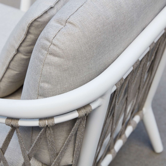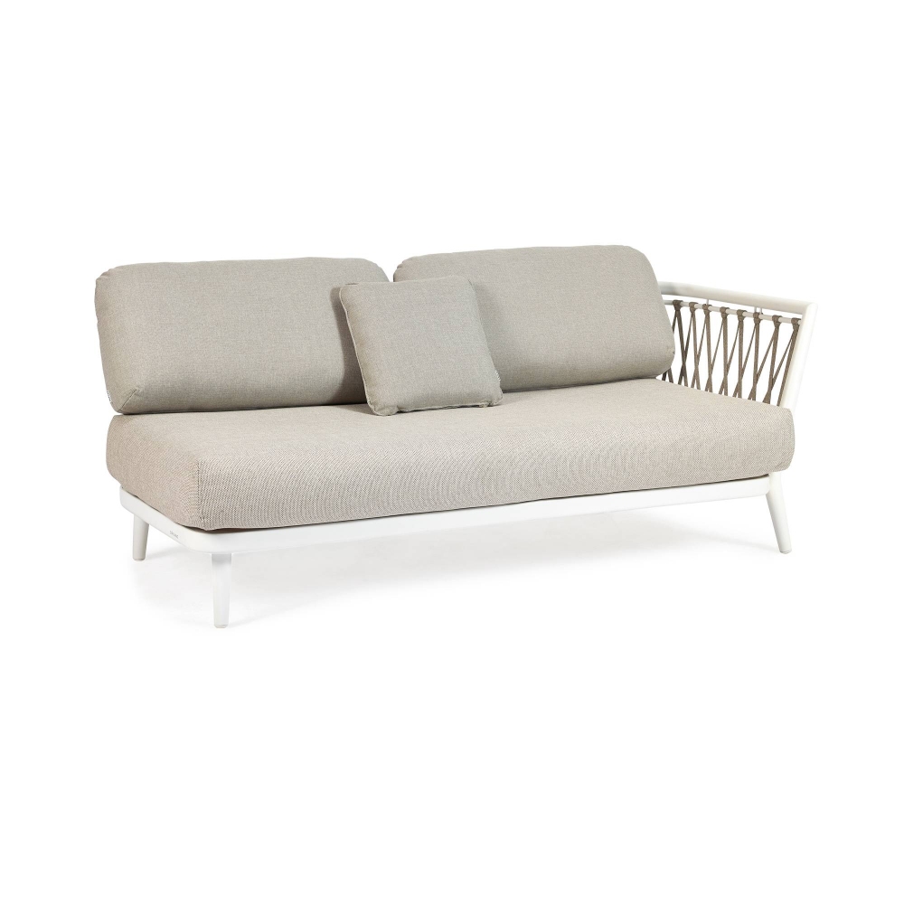 The left corner double seat "Diamond" is a magnificent sofa crafted with unique materials such as durable and robust aluminum, elegant and graceful rope, and the cushions' ultra-soft fabric padding, which resists fading from the sun, rain, or temperature fluctuations, preserving their beautiful appearance unaltered. Available in four wonderful options, the Diamond sofa seamlessly blends with any style, from classic and traditional to modern and stylish. The Diamond double seat transforms any space in your home into an oasis of pure relaxation, perfect for hosting guests or enjoying moments of tranquility, thanks to its left corner design. Moreover, the left corner allows for space optimization, enabling the creation of intimate conversational areas or the enjoyment of the surrounding landscape. The Diamond double seat is not just a piece of furniture but a true gem that beautifies and enriches your home. Choose Diamond, and it will become your favorite comfort corner.