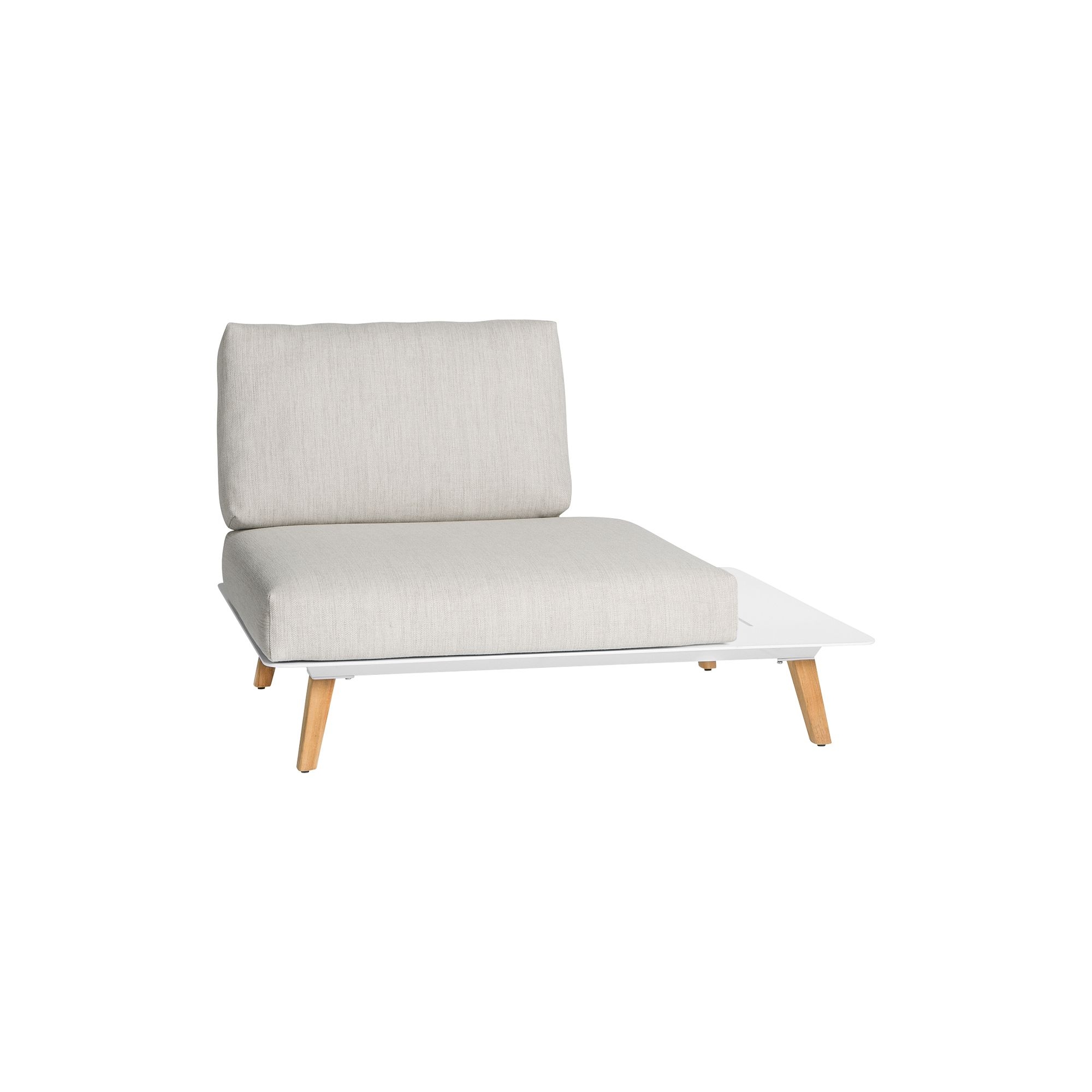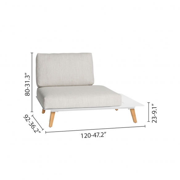 The Link 05 Left End Seat, 240 cm, with included cushions, has been crafted using the highest quality materials: it features a resilient aluminum frame that guarantees stability and sturdiness, the exquisitely delicate Teak wood that pledges resistance against various atmospheric agents, and the upholstered fabric that delivers maximum softness and comfort. This outdoor right end seat is an ideal selection for those who desire to meld quality and elegance. The Link 05 end seat comes with cushions, sumptuously soft clouds made of high-grade fabric, easily detachable for washing due to the Velcro fastenings, offering an irresistible embrace to anyone wishing to unwind. The Link 05 right end seat is perfect for accommodating several individuals and reveling in the comfort of this splendid piece in larger, open-plan spaces, providing a sophisticated and stylish furnishing solution. Link 05 enhances any type of setting with its impeccable and comfortable style, whether it's a veranda or a lounge area. Its design, characterized by clean and contemporary lines, is perfectly adaptable to a variety of decorating styles, from the most traditional to the most modern. Opting for this Link 05 left end seat represents an investment that is both aesthetically sophisticated and highly functional.
