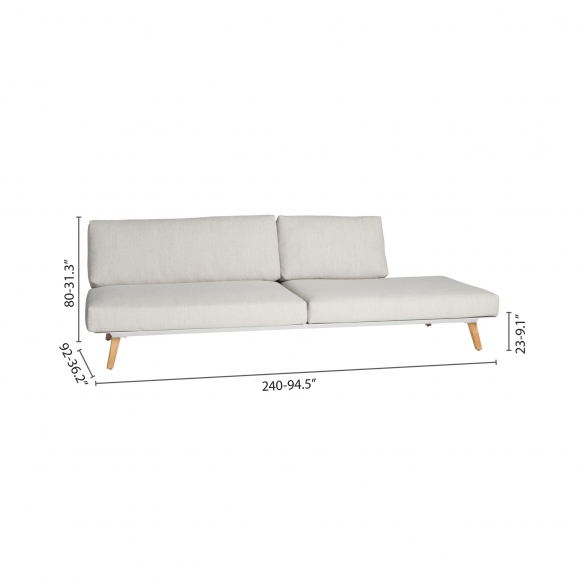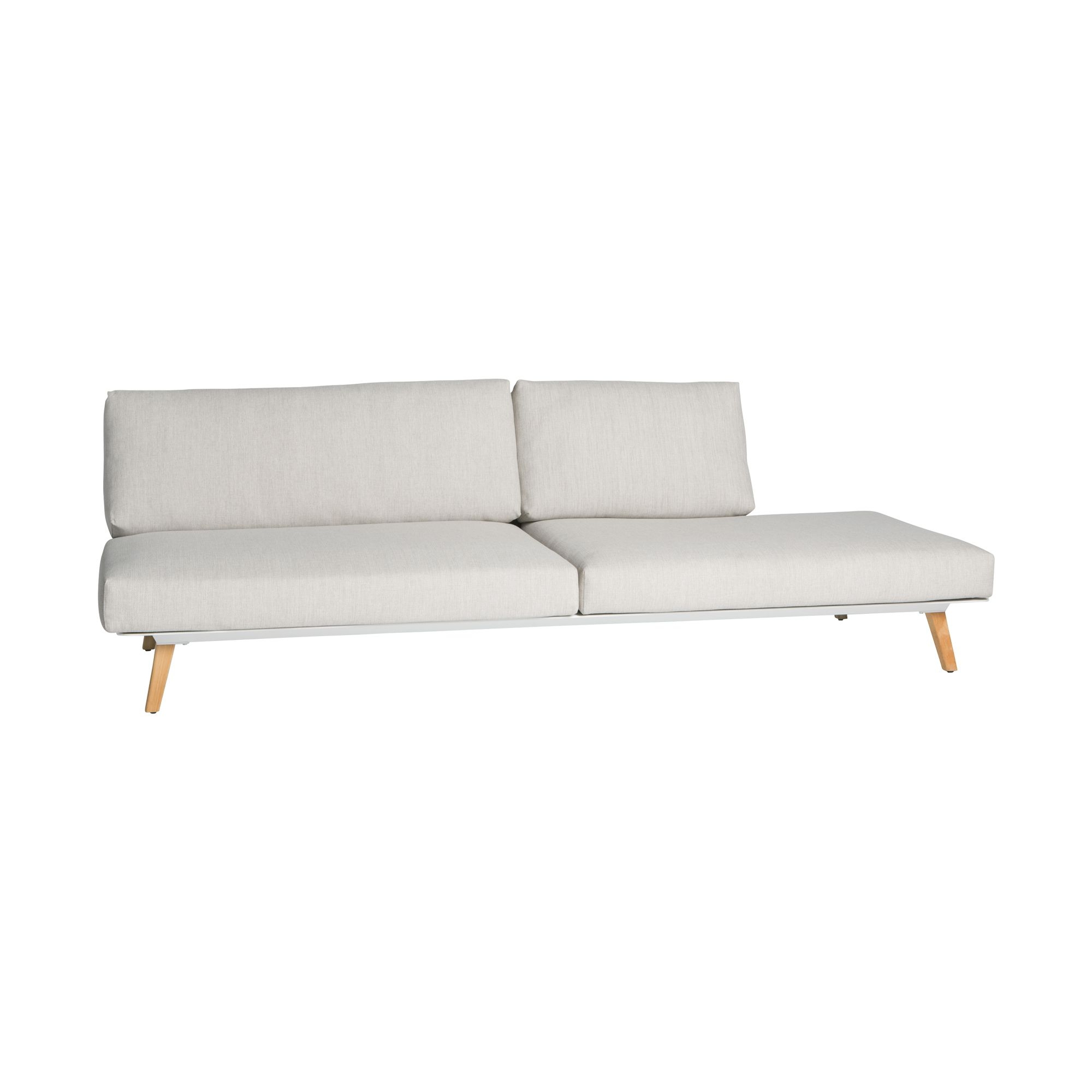 The Link 04 Left End Seat, 240 cm, with included cushions, has been crafted using the highest quality materials: it features a resilient aluminum frame that guarantees stability and sturdiness, the exquisitely delicate Teak wood that pledges resistance against various atmospheric agents, and the upholstered fabric that delivers maximum softness and comfort. This outdoor right end seat is an ideal selection for those who desire to meld quality and elegance. The Link 04 end seat comes with cushions, sumptuously soft clouds made of high-grade fabric, easily detachable for washing due to the Velcro fastenings, offering an irresistible embrace to anyone wishing to unwind. The Link 04 right end seat is perfect for accommodating several individuals and reveling in the comfort of this splendid piece in larger, open-plan spaces, providing a sophisticated and stylish furnishing solution. Link 04 enhances any type of setting with its impeccable and comfortable style, whether it's a veranda or a lounge area. Its design, characterized by clean and contemporary lines, is perfectly adaptable to a variety of decorating styles, from the most traditional to the most modern. Opting for this Link 04 left end seat represents an investment that is both aesthetically sophisticated and highly functional.