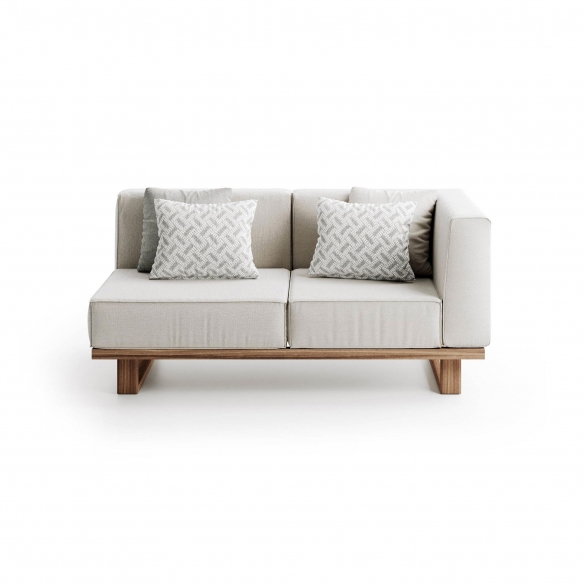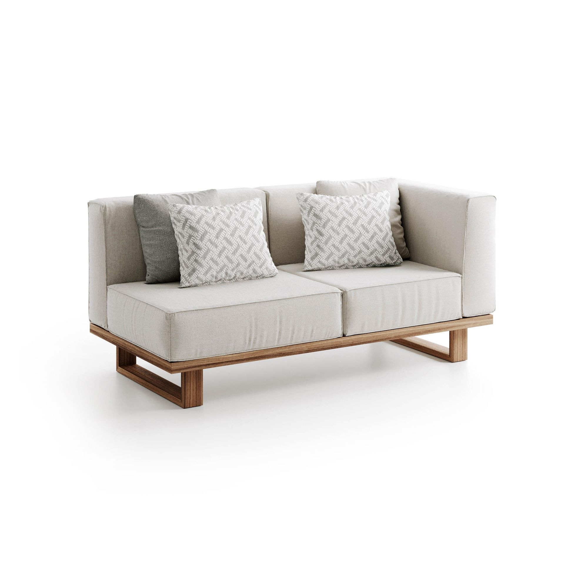 The 9.zero corner two-seater module is crafted with a structure of solid Asian teak and features seating made of high-quality draining rubber, covered in technical outdoor fabric. The design of the base modules allows for the creation of numerous compositional solutions to meet a variety of space and functionality needs. The structure of each module is made with nine slats of Indonesian teak wood, each nine centimeters wide, polished and oiled to highlight the natural beauty and ensure resistance to external elements. The cushions, designed to offer maximum comfort, are made with high-quality draining rubbers and covered with fabrics selected from the Atmosphera outdoor collection, ensuring durability and suitability for outdoor use. The 9.zero corner two-seater module perfectly integrates elegance and practicality, making it an ideal element to enhance any outdoor space with a personal touch of style, without compromising the comfort and robustness necessary to fully enjoy outdoor life. Designed by Atmosphera Creative Lab.