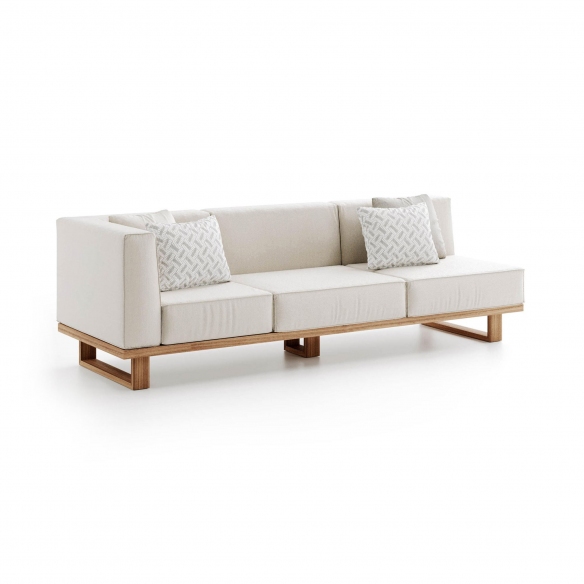 The 9.zero corner three-seater module is crafted with a structure of solid Asian teak and features seating made of high-quality draining rubber, covered in technical outdoor fabric. The design of the base modules allows for the creation of numerous compositional solutions to meet a variety of space and functionality needs. The structure of each module is made with nine slats of Indonesian teak wood, each nine centimeters wide, polished and oiled to highlight the natural beauty and ensure resistance to external elements. The cushions, designed to offer maximum comfort, are made with high-quality draining rubbers and covered with fabrics selected from the Atmosphera outdoor collection, ensuring durability and suitability for outdoor use. The 9.zero corner three-seater module perfectly integrates elegance and practicality, making it an ideal element to enhance any outdoor space with a personal touch of style, without compromising the comfort and robustness necessary to fully enjoy outdoor life. Designed by Atmosphera Creative Lab.