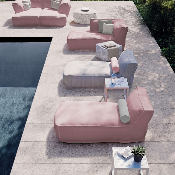 The Soft outdoor sunbed is made with polystyrene microbead padding, a breathable and draining technical fabric cover, and an outdoor fabric coating. Available in various fabrics and colors, the Soft outdoor sunbed is designed to transform any open space into a private paradise corner. Made with the most innovative materials, the Soft sunbed is characterized by its polystyrene microbead padding, which ensures exceptional comfort and perfectly ergonomic seating. Wrapped in a breathable and draining technical fabric cover, this sunbed promises not only unparalleled relaxation but also quick drying, making it ideal for use near pools or in gardens. The high-quality outdoor fabric covering guarantees superior resistance to weather and UV rays, maintaining the vibrancy of colors and the integrity of the fabric over time. Available in a variety of colors and finishes, the Soft outdoor sunbed harmoniously adapts to any external context, from a minimalist terrace to a lush garden. Its lightweight yet extremely resistant structure, together with the modular design, offers the flexibility to customize the layout of the outdoor space according to one's needs and personal tastes. Whether it's reading a book, sunbathing, or simply enjoying the dolce far niente, the Soft outdoor sunbed guarantees precious moments of relaxation. Easy to clean and maintain, the Soft sunbed represents the ideal solution for those seeking the perfect combination of refined aesthetics and practicality, without ever sacrificing maximum comfort. Choosing the Soft outdoor sunbed by Atmosphera Creative Lab means embracing a vision of accessible luxury, where design, comfort, and functionality blend into an unprecedented outdoor experience. Designed by Atmosphera Creative Lab.