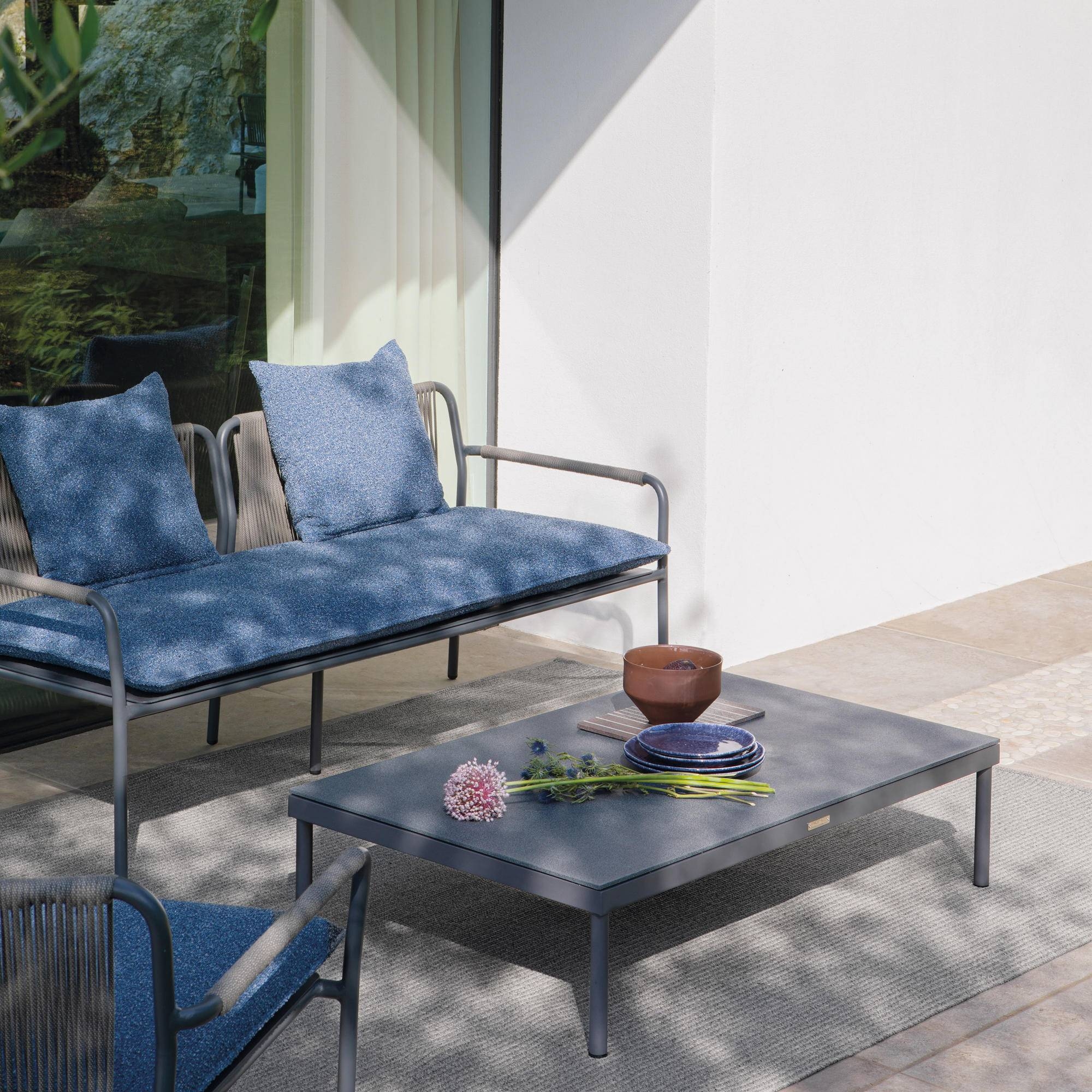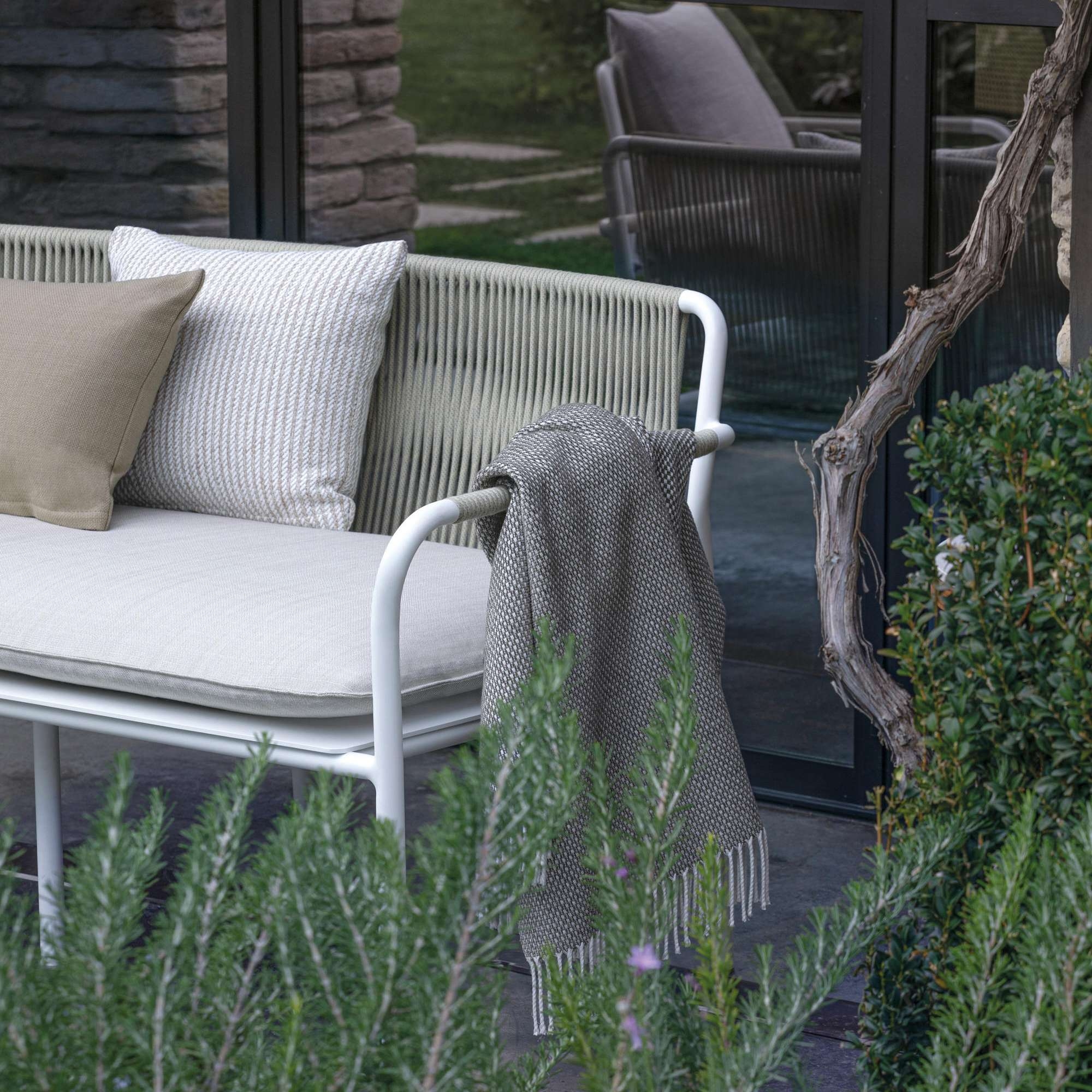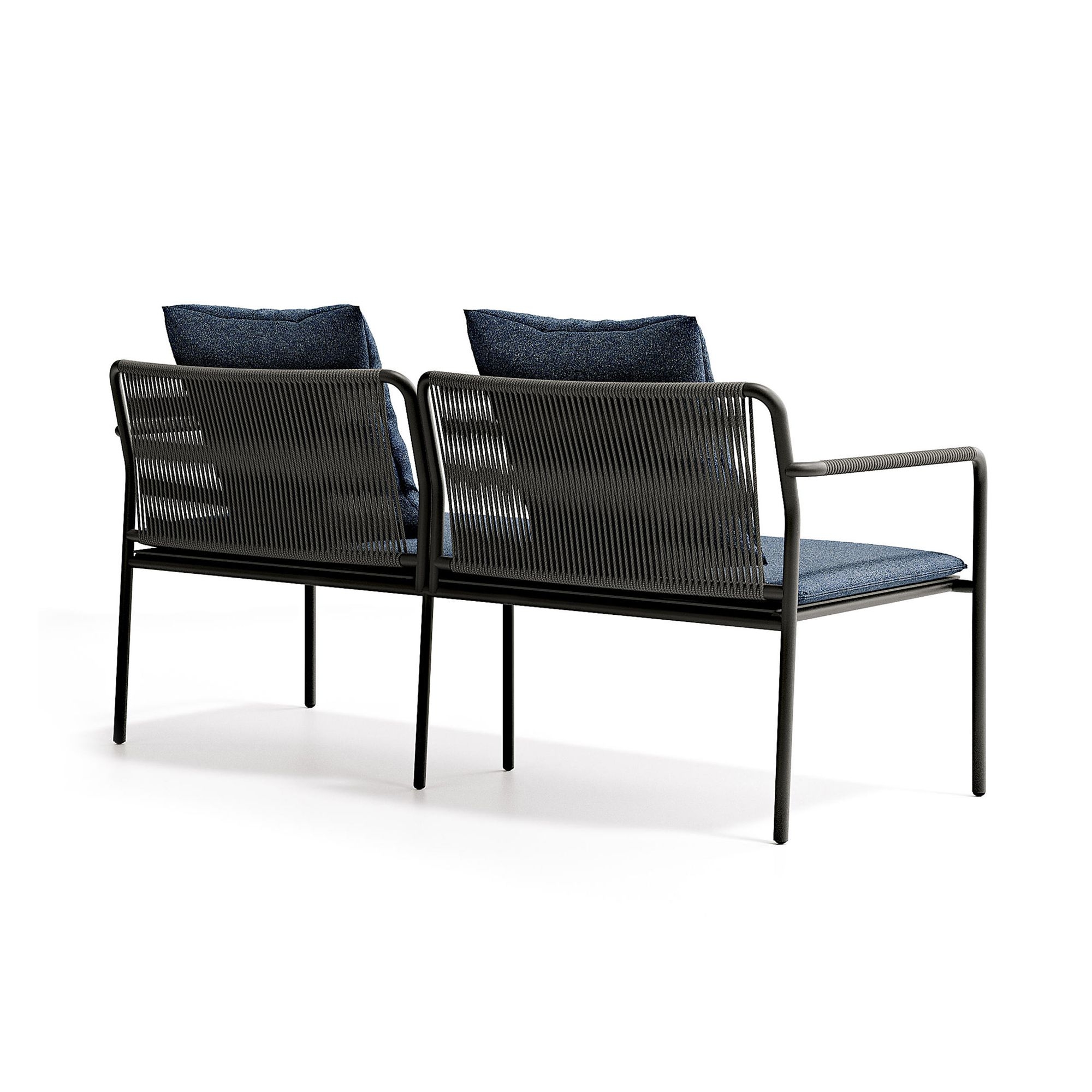 The Air outdoor sofa is made with an aluminum structure, nautical rope backrest, and an optional outdoor fabric cushion. Featuring an elegant and contemporary design, the Air outdoor sofa boasts a solid aluminum frame complemented by a complex of nautical ropes that form the backrest, offering unparalleled visual and ergonomic comfort. Available in white or graphite colors, it perfectly integrates into any outdoor setting, adding a touch of sober elegance. The seating cushion, optional but highly recommended, is made of weather-resistant fabric, ensuring durability and easy maintenance. The Air sofa is ideal for those wishing to create a refined and welcoming lounge area in gardens, terraces, or near the pool, promising to transform any outdoor space into a relaxation oasis. Carefully designed by Atmosphera Creative Lab, this sofa represents a perfect fusion of functionality and style, inviting moments of pure relaxation outdoors. Designed by Atmosphera Creative Lab.