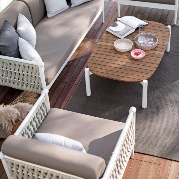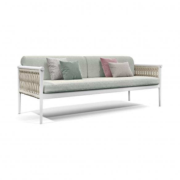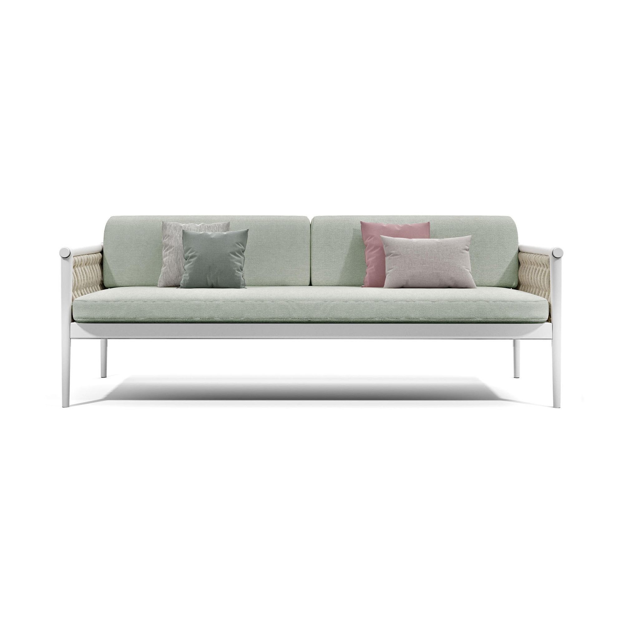 Dandy 2.0 outdoor sofa made with aluminum structure, side panels in nautical rope and seat and back cushions covered in outdoor fabric. Available in various color and fabric combinations, the Dandy 2.0 outdoor sofa is an unbeatable creation in terms of style and comfort. Expanding the Dandy collection, this sofa stands out for its clean and modern line, with a resistant aluminum supporting structure and refined details such as the nautical rope side panels, chosen for their undisputed durability and visual appeal. The seat and back cushions, covered in specific outdoor fabric, guarantee superior comfort and resistance to adverse weather conditions. Available in a range of color and fabric combinations, the Dandy 2.0 sofa expertly adapts to every circumstance, allowing you to customize your outdoor space according to your desires. Dandy 2.0 is not just an outdoor sofa: it is the promise of a welcoming refuge where every moment of rest turns into a moment of sublime pleasure. Designed by Atmosphera Creative Lab.