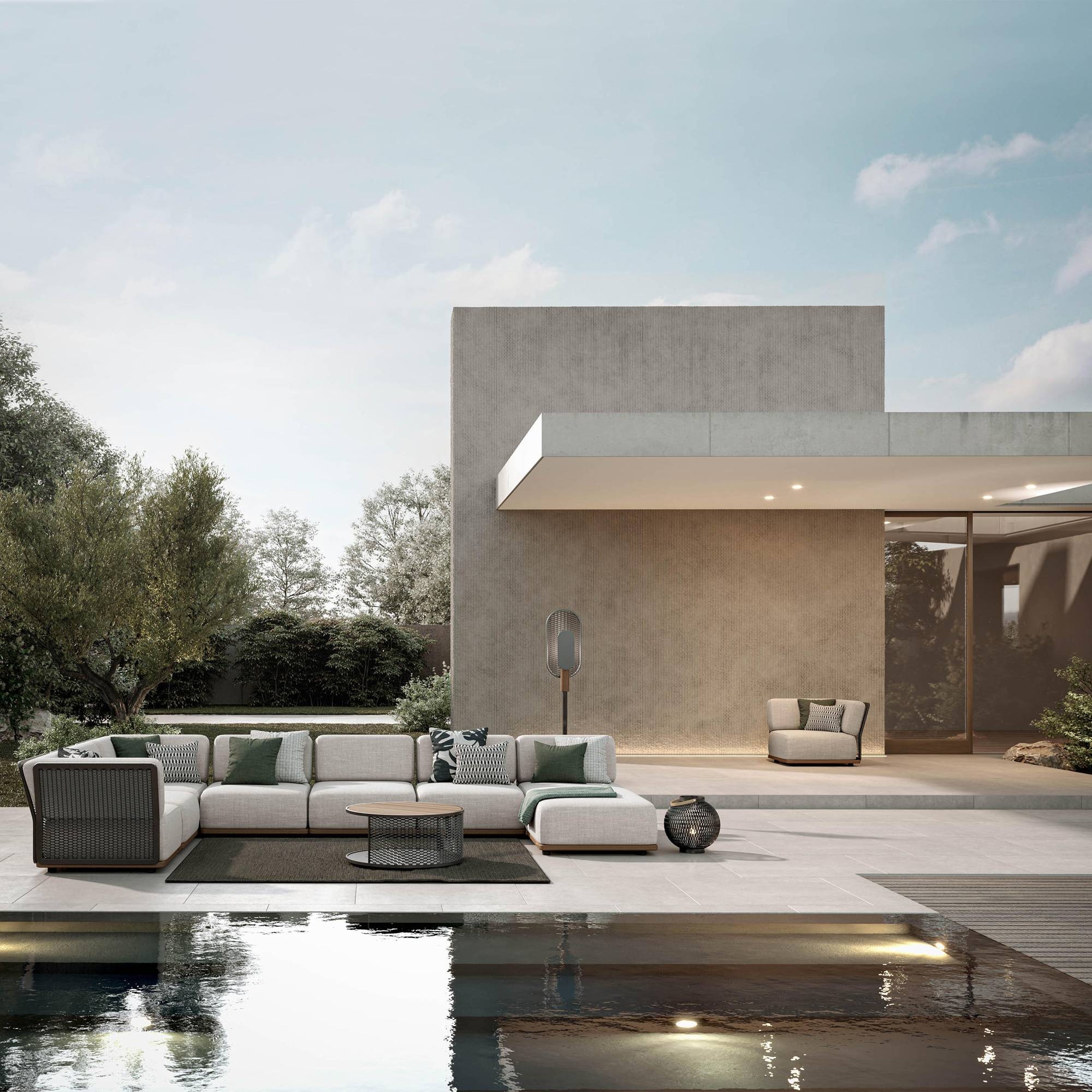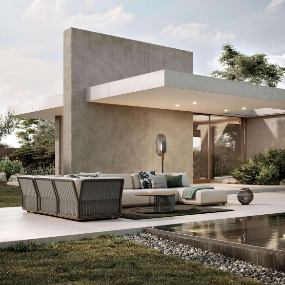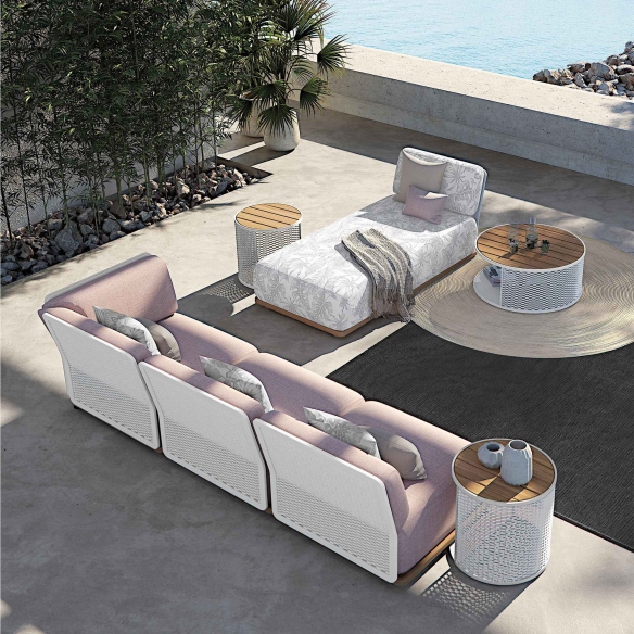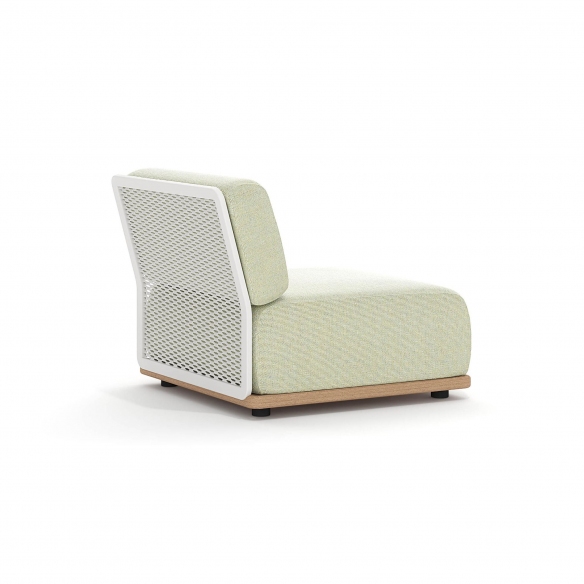 Discover the central module of the Switch Sofa, crafted with an aluminum structure, a teak-tinted base, and cushions for the seat and back upholstered in outdoor fabric. Ideally designed to transcend the boundaries between indoors and outdoors, this piece of outdoor furniture is based on a white aluminum frame, transforming into a sophisticated texture that invites creativity and innovation in spatial composition. Atmosphera's vision for outdoor spaces materializes through the integration of modern elements such as servomobili and atmospheric lighting, making each module of the Switch sofa not just a seating element, but a true hub of comfort and style. The ability to customize the arrangement of the modules allows for designing the lounge environment of your dreams, ensuring unmatched completeness in the design of your outdoor space. Adopting a design philosophy that embraces versatility and pure aesthetics, the central module of the Switch Sofa stands out as a privileged choice for those looking to elevate the expression of their garden, patio, or terrace. Its attractiveness lies in its ability to blend and adapt, creating a livable environment that reflects the essence of the surrounding space. Designed by Atmosphera Creative Lab.